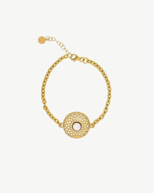 Halsketten, Ohrringe, starre Armbänder, Armbänder oder Ringe, in jedem ihrer Stücke, praktisch skulptural , ist die Architektur des Designs der Protagonist, aber nicht weniger wichtig ist sein Rohmaterial: vergoldetes Silber und organische runde mediterrane Perlen im Ton. Weiß.