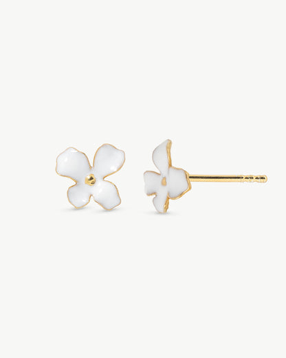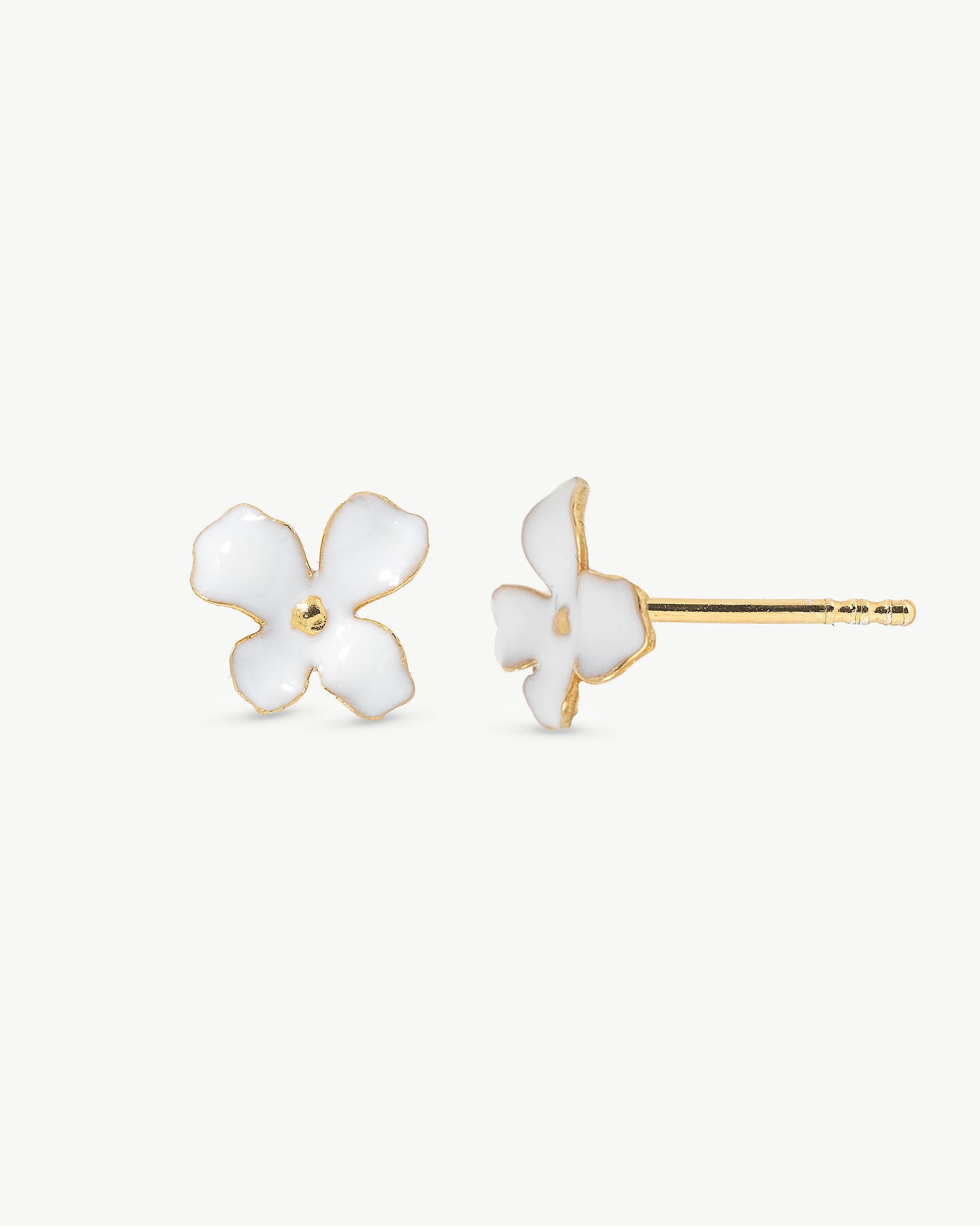7 mm große Ohrringe aus 18 Karat vergoldetem Silber mit einer weiß emaillierten Blume und einem Spike-Verschluss.