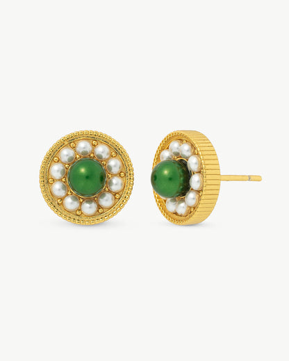 Ohrstecker aus 18k vergoldetem Silber mit einer 2,5 mm großen runden grünen Perle und 1 mm großen weißen Perlen.
