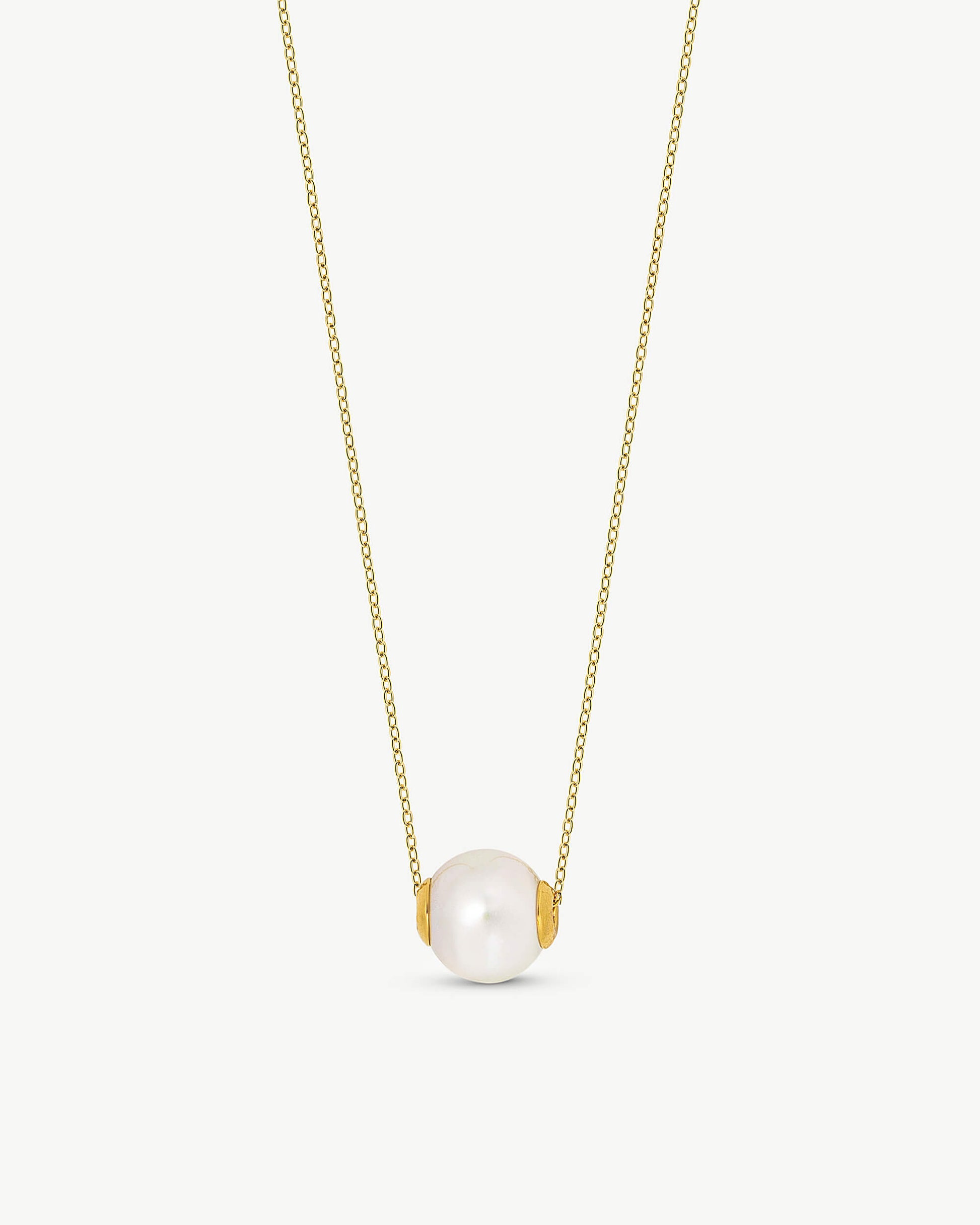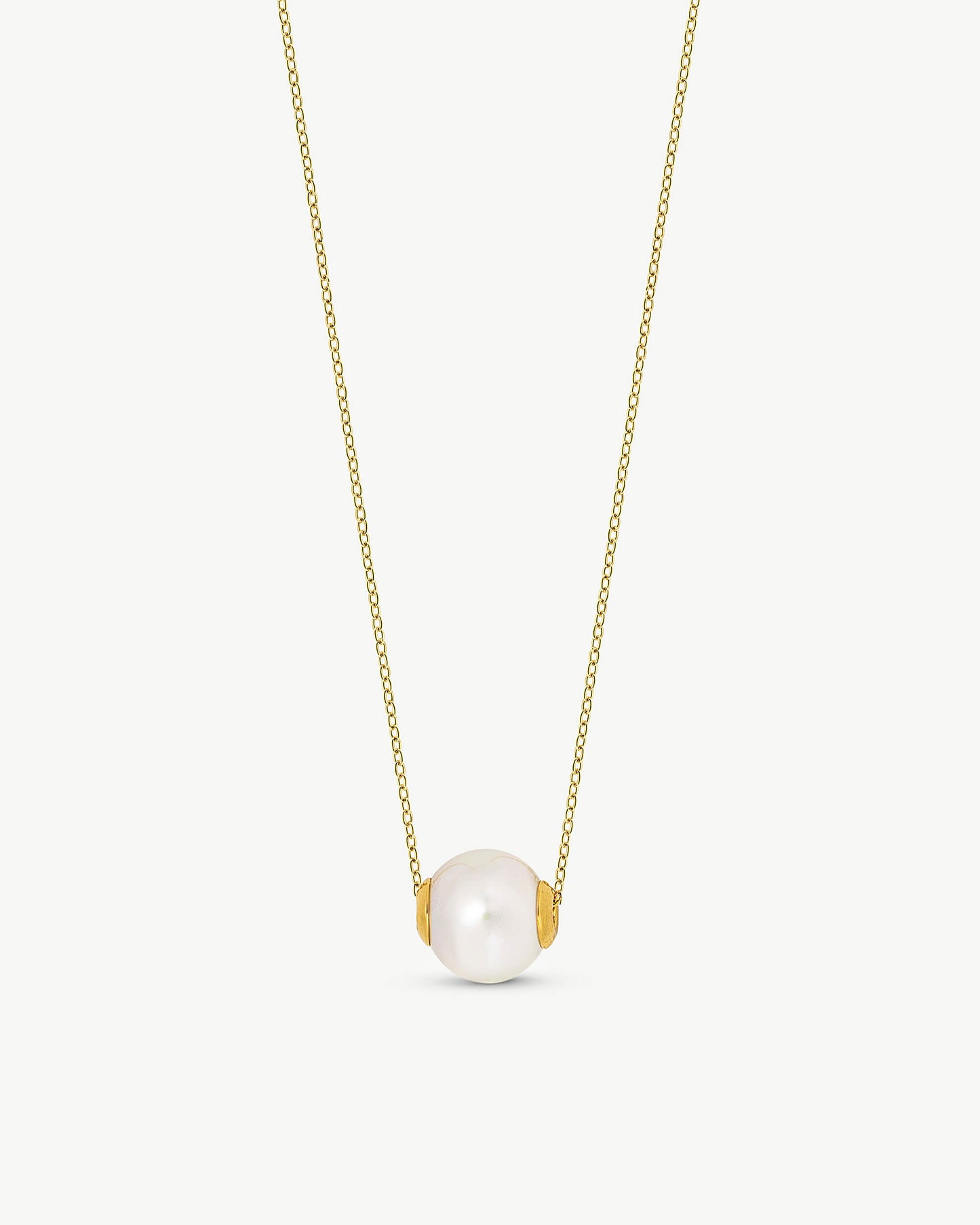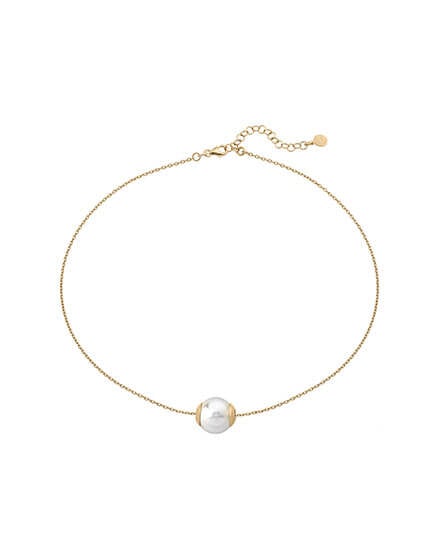 33/43 cm langes Halsband aus 18 Karat vergoldetem Silber mit einer 14 mm großen runden weißen Perle. Das Design verleiht einen frischen und vielseitigen Touch und ermöglicht es Ihnen, Ihren persönlichen Stil zu jedem Anlass auszudrücken.