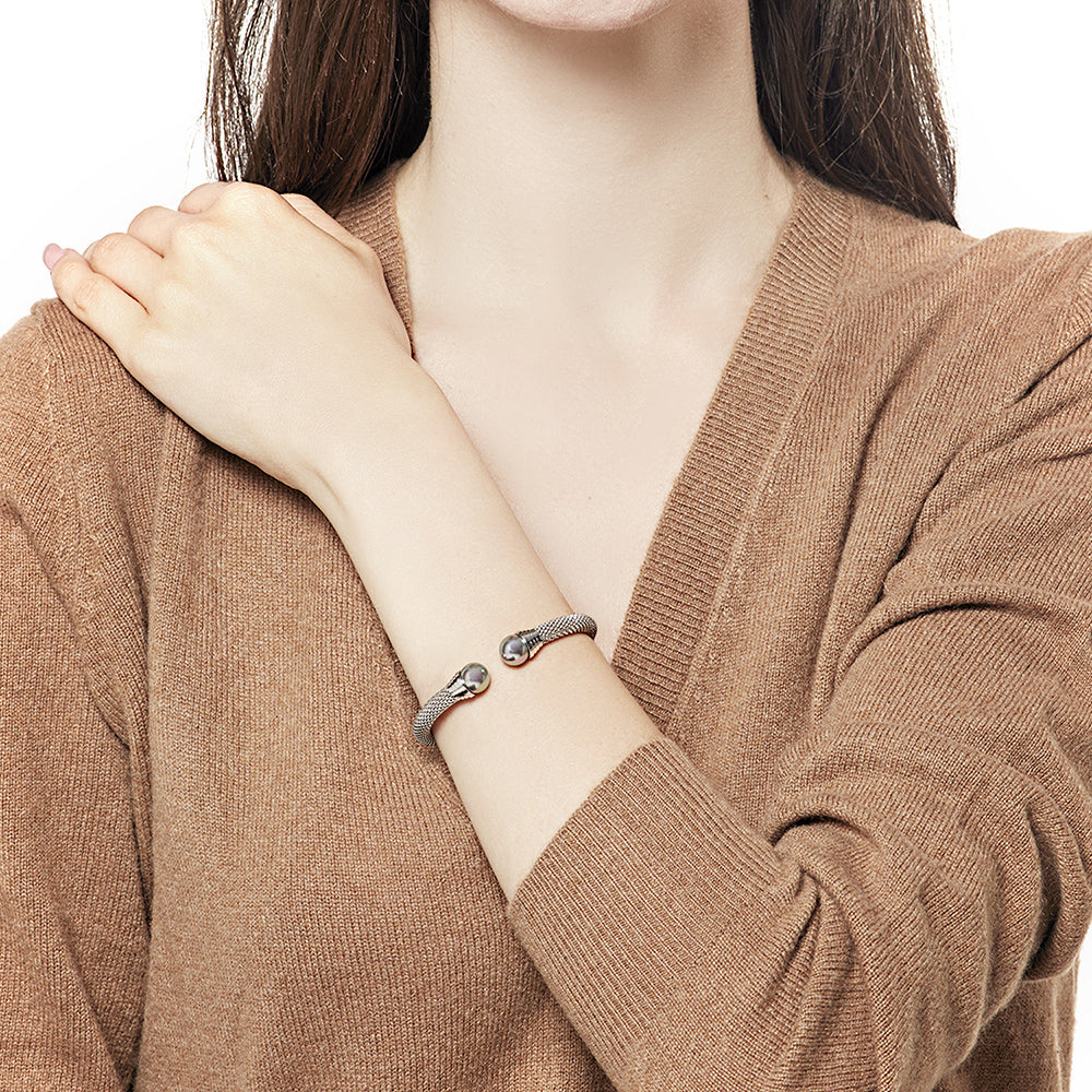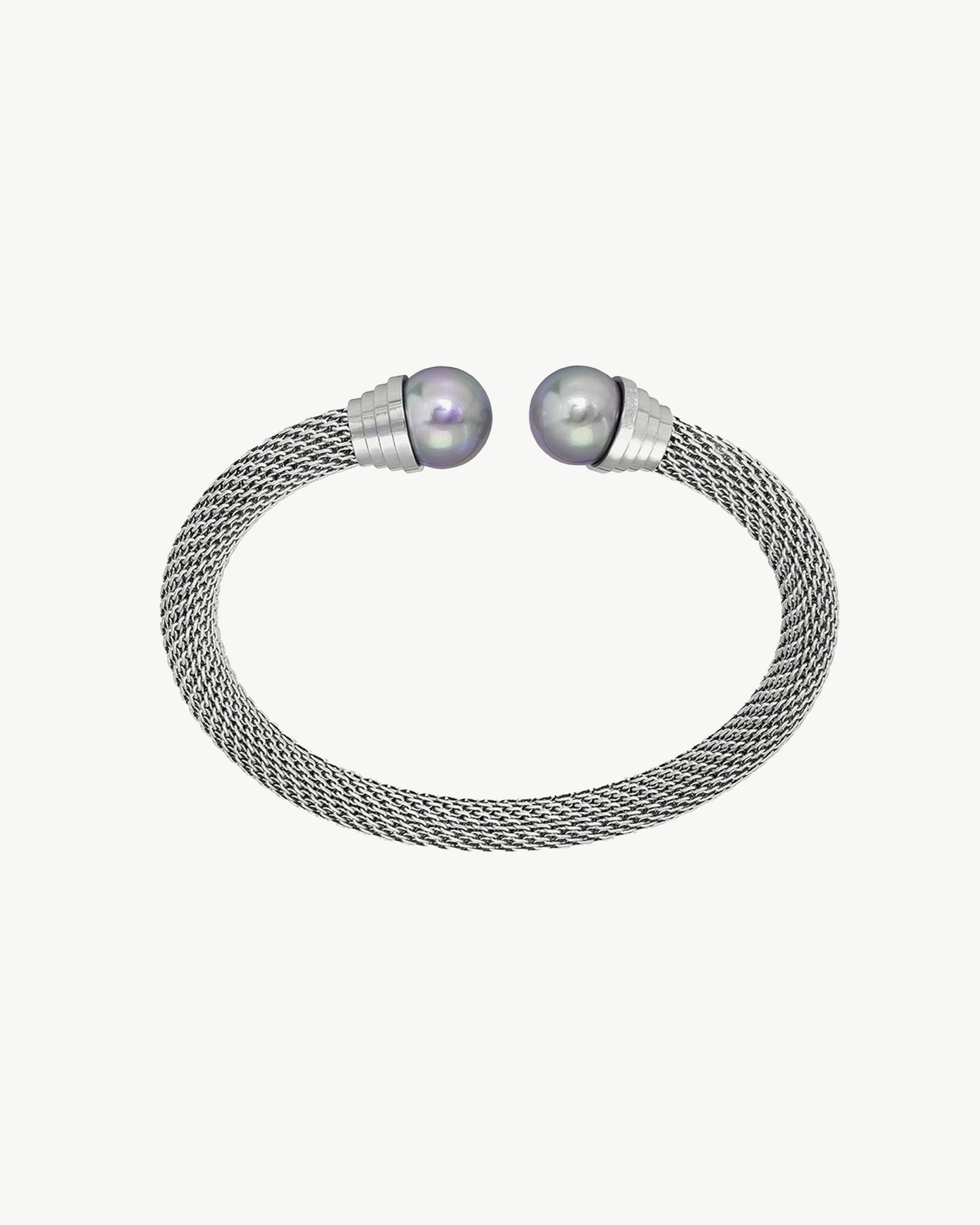 Starres 46 x 58 mm großes Stahlarmband oder Armband mit 2 10 mm großen grauen runden Perlen an den Enden.