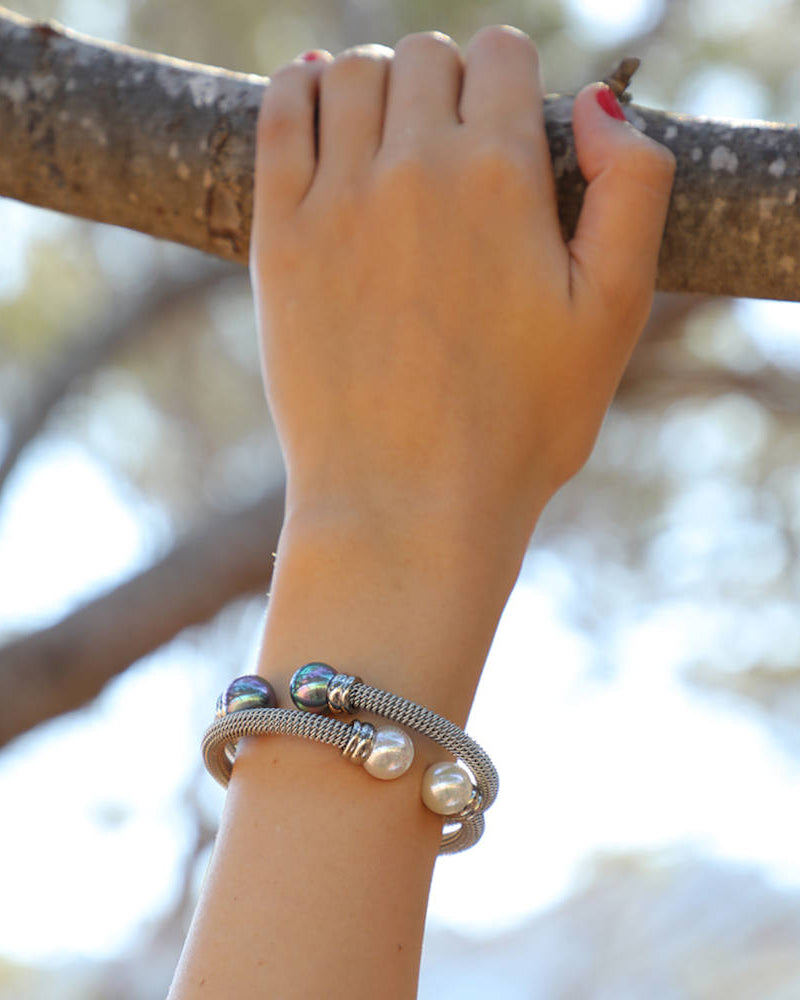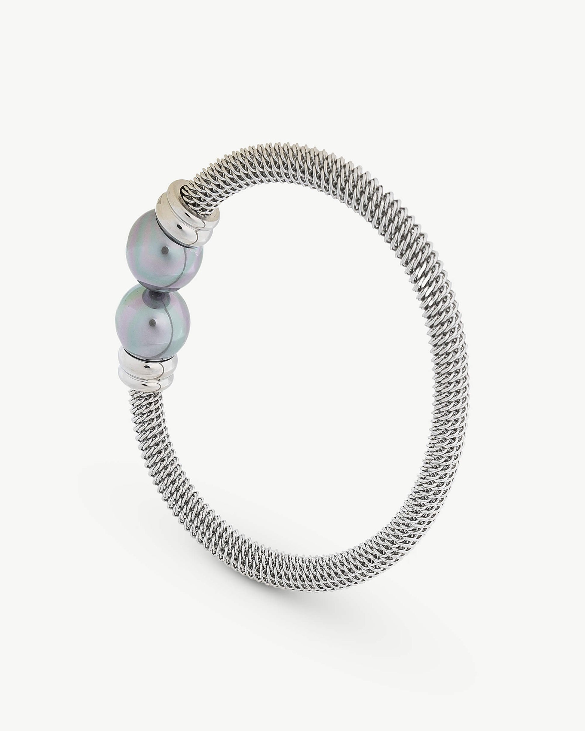 Starres rhodiniertes Stahlarmband, 12 mm graue runde Perlen. Für diese Kollektion von Armbändern, Ringen und Ohrringen, die aus hochwertigem Stahl gefertigt und mit Perlen verziert sind, wurde jedes Stück so gestaltet, dass es die Schlichtheit von Stahl mit der Zeitlosigkeit von Perlen verbindet.
