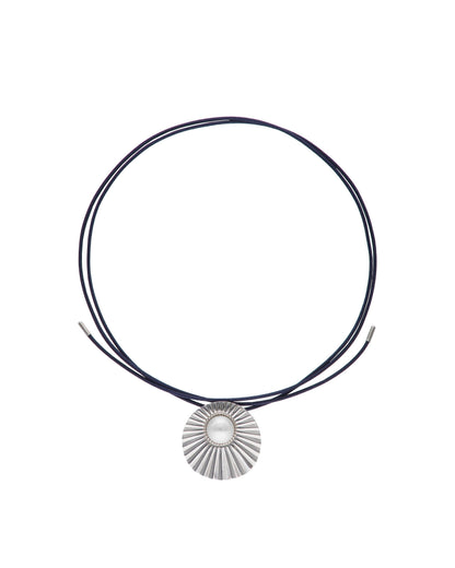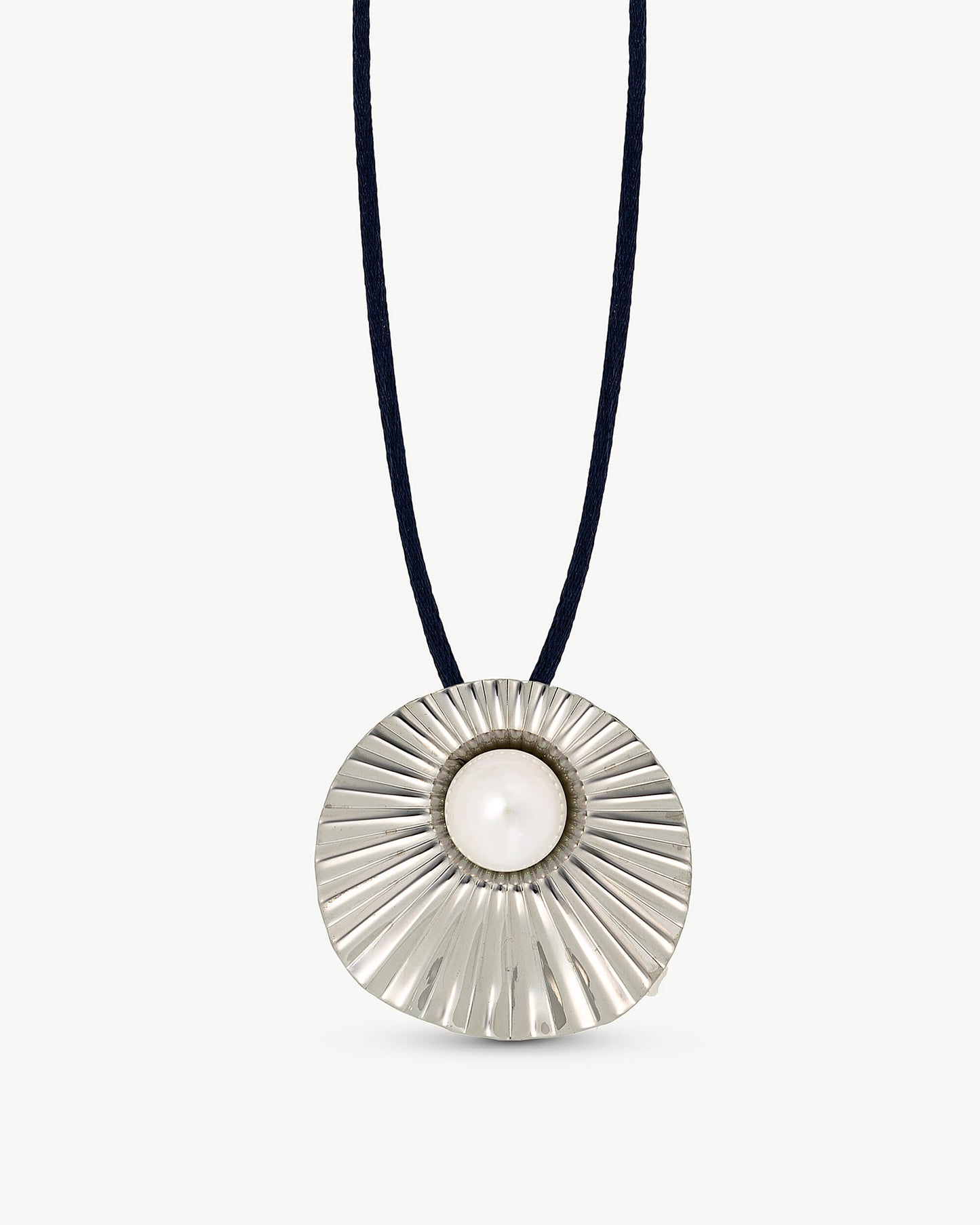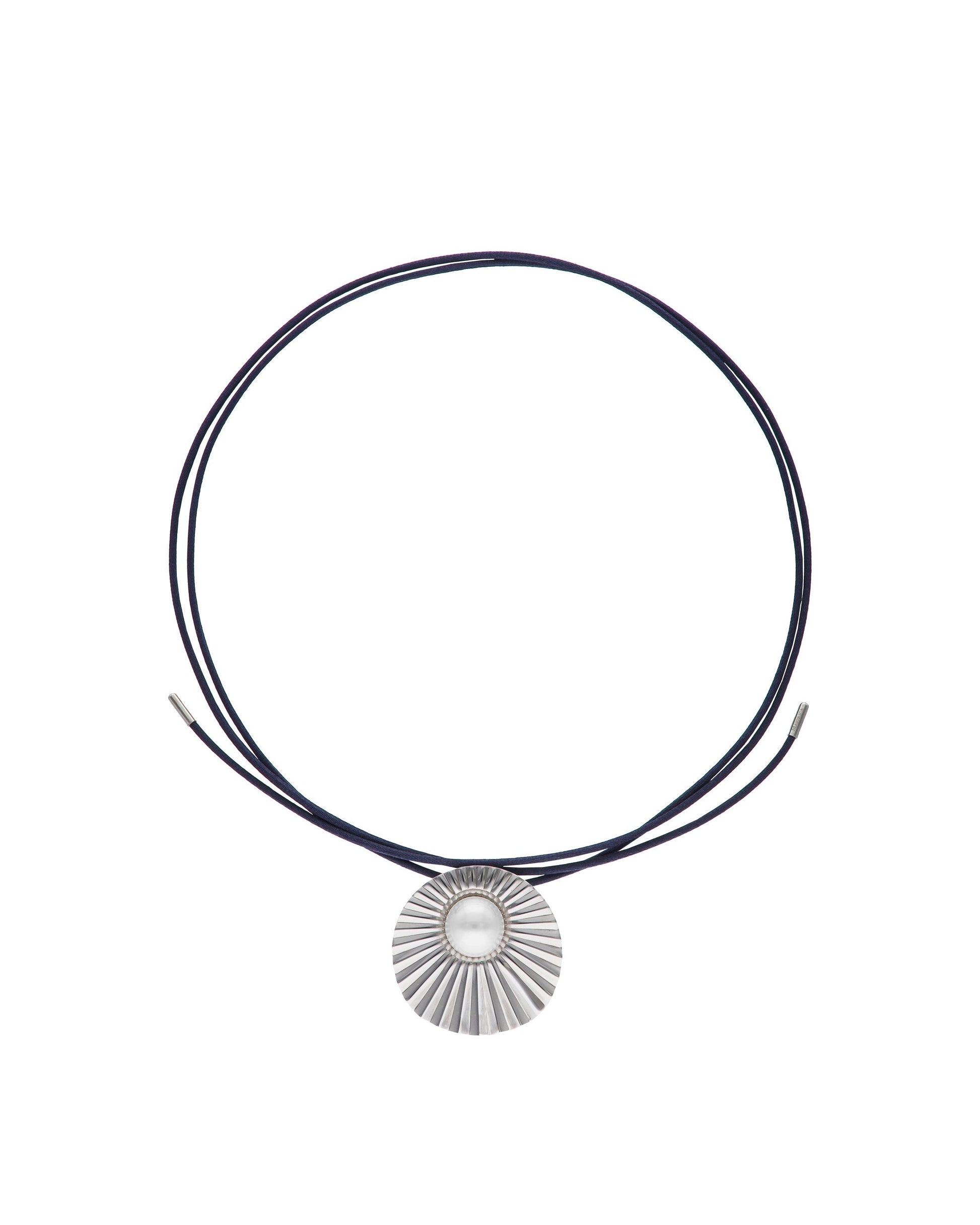 Stahlanhänger mit 14 mm großer weißer Perle. Blaue Seidenschnur, 130 cm lang. Die organische Natur, die zu einem Juwel verarbeitet wird, ist aus dem Bedürfnis entstanden, einer Kollektion Leben einzuhauchen, in der einzigartige, avantgardistische Stücke von Hand gefertigt werden können.
