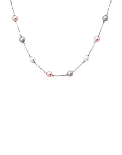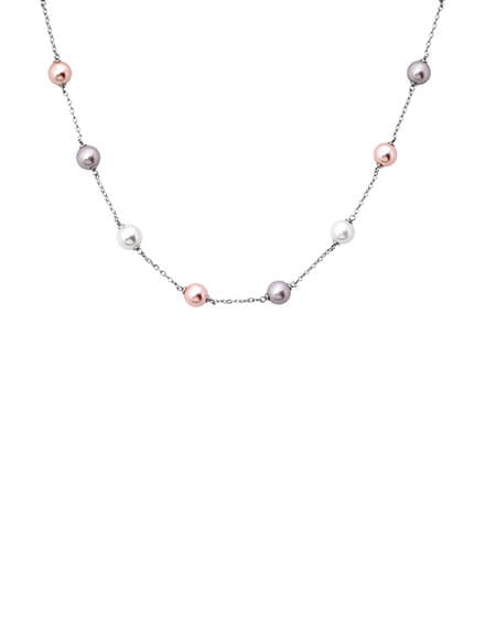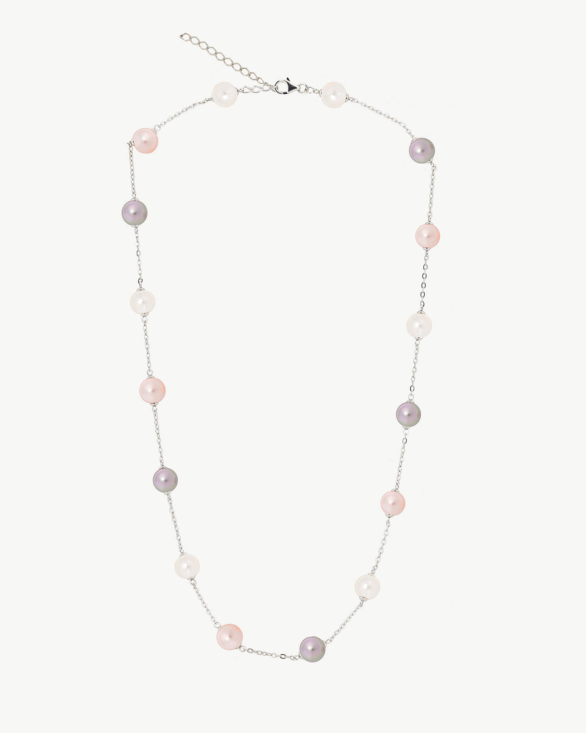 45/50 cm lange Halskette aus rhodiniertem Silber, 8 mm große bunte runde Perlen (weiß, nuage und rosa). Eine Sammlung, die Fantasie ist.