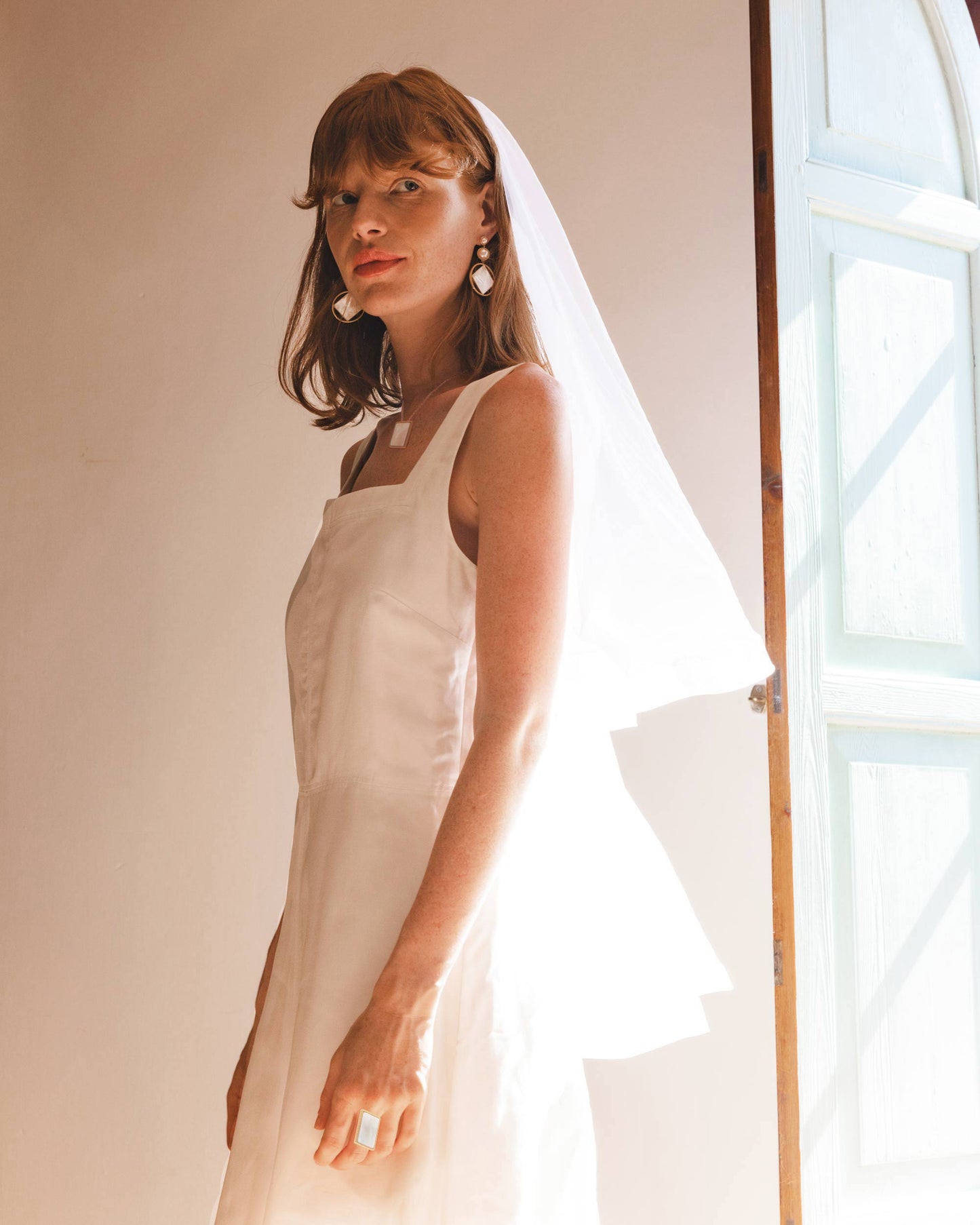 Die langen Ohrringe stilisieren das Gesicht mit ihrer subtilen Bewegung, der Anhänger betont das Dekolleté mit seinem perlenartigen Glanz und der Ring verleiht dem Ganzen den letzten Schliff an Raffinesse.