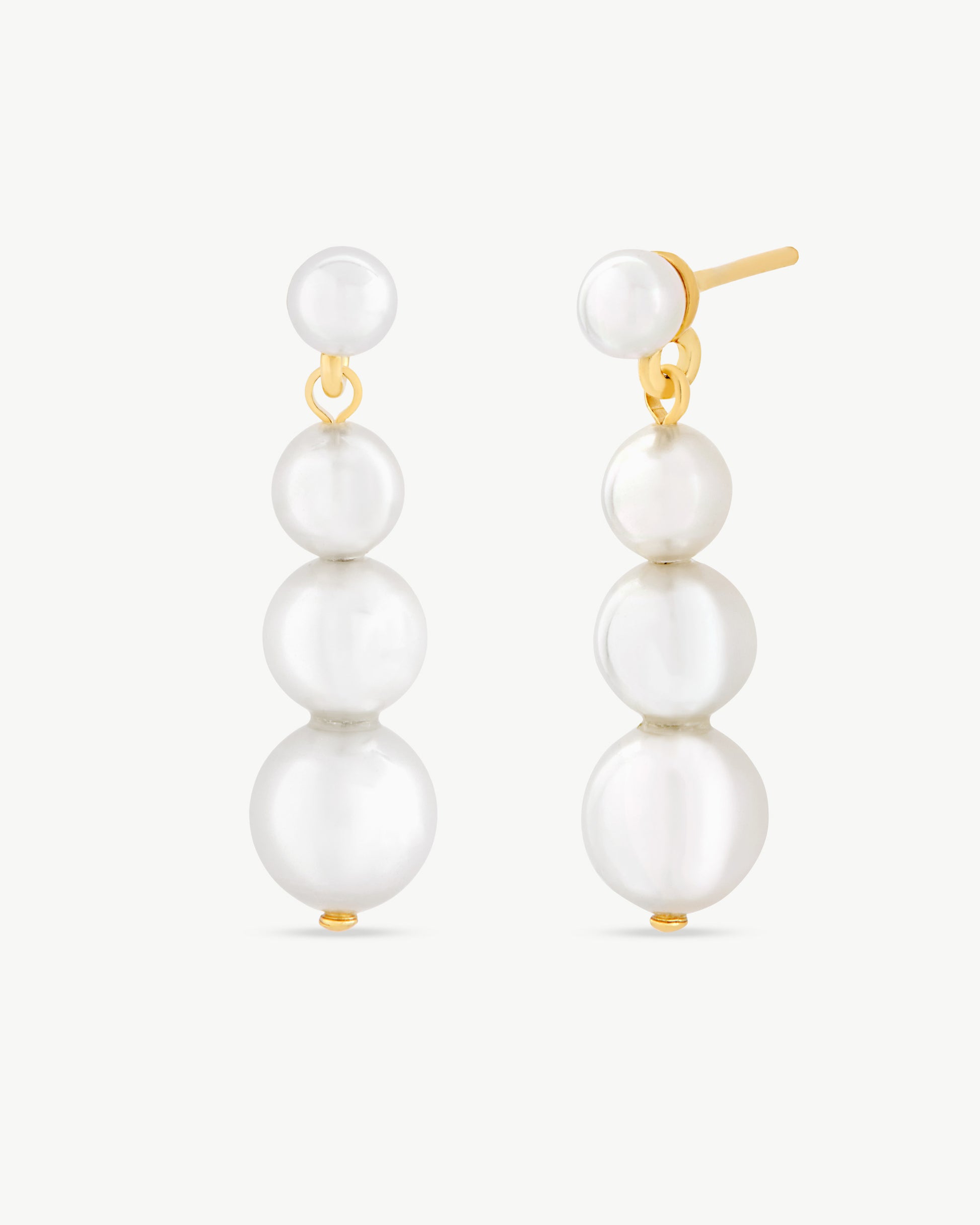 2,5 cm lange Ohrringe aus 18 Karat vergoldetem Sterlingsilber. Diese langen Ohrringe aus der Petit Collection bestehen aus vier runden weißen Perlen in aufsteigender Reihenfolge von 4, 5, 6 und 7 mm. Sie werden mit einem Stiftverschluss geschlossen.