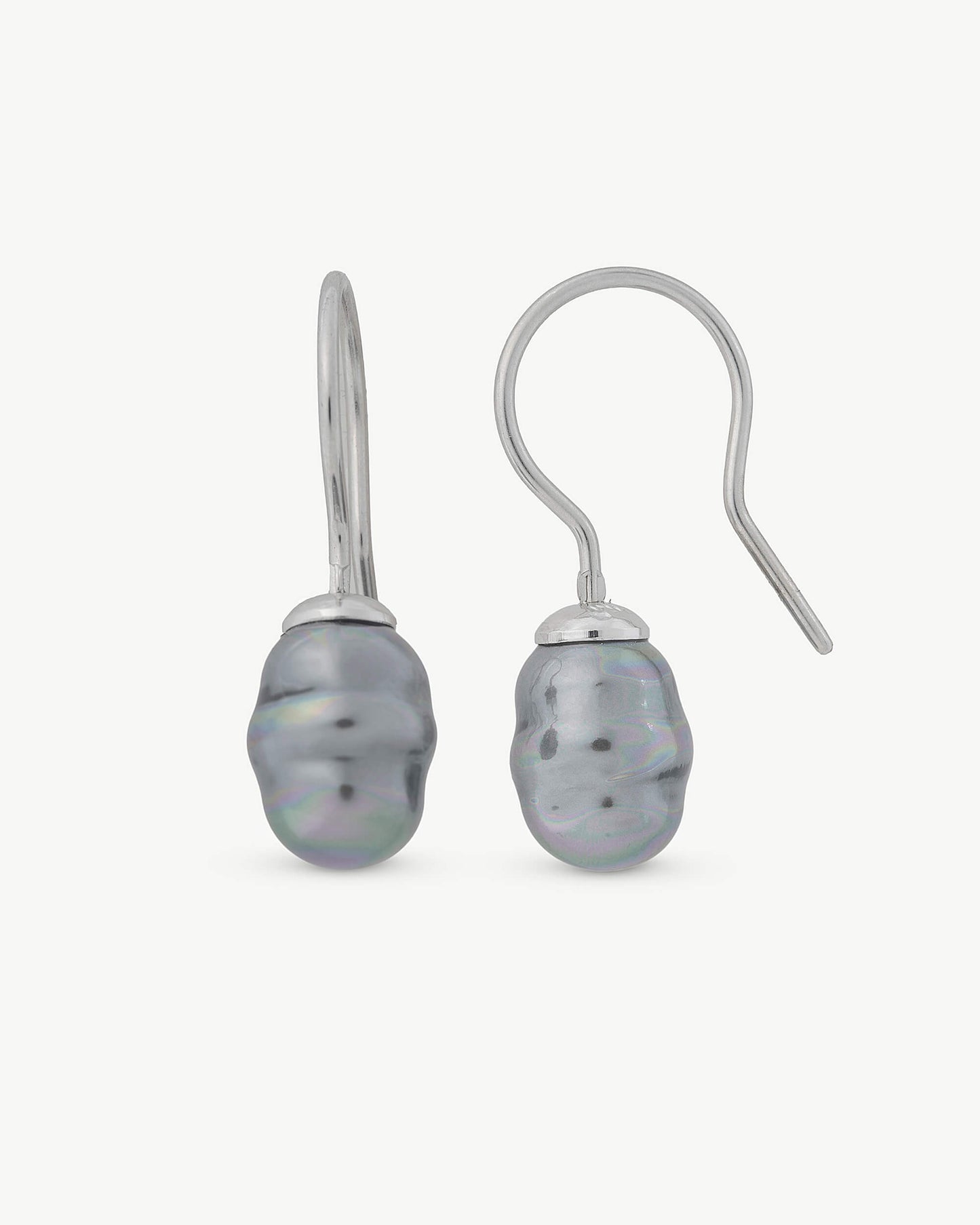 Kurze Hakenohrringe aus rhodiniertem Silber, 8 mm graue Barockperlen. Schmuck und Perlen mit romantischem und sehr femininem Design.