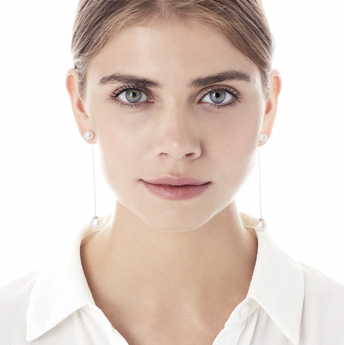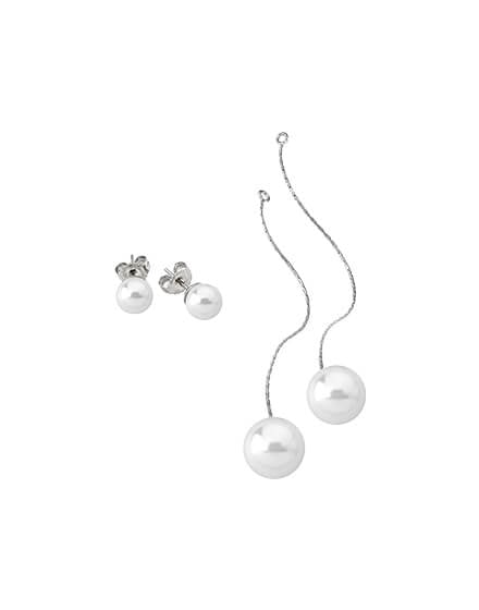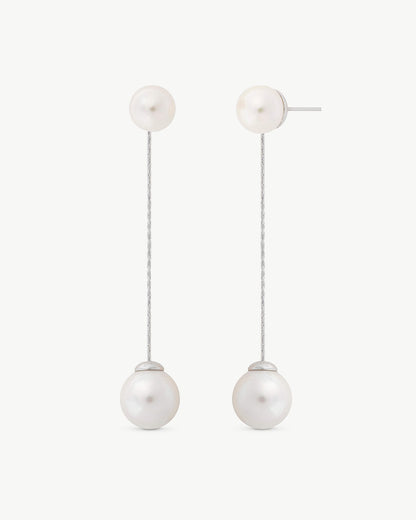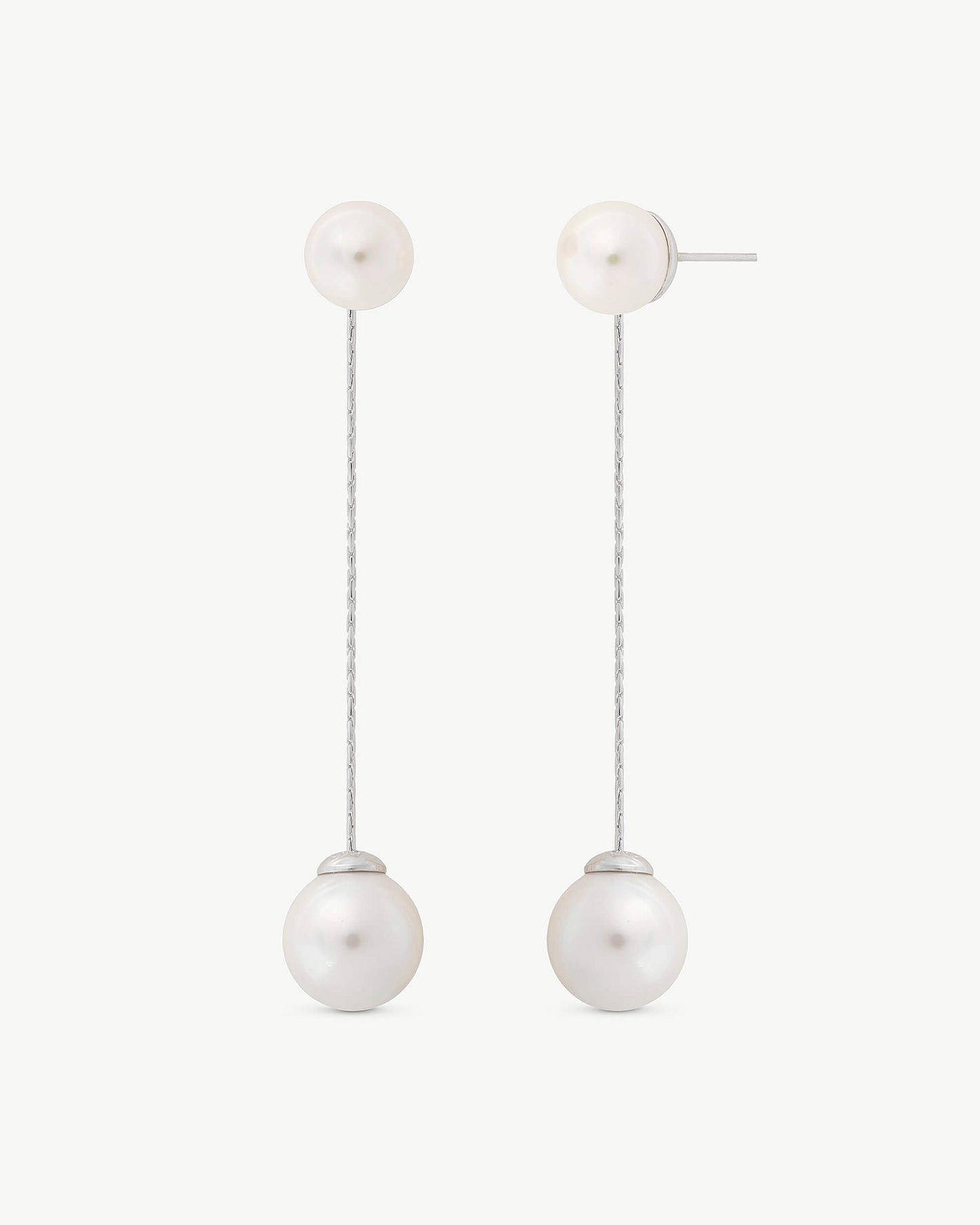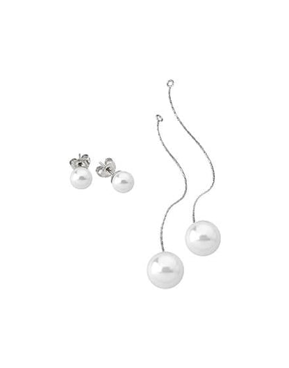 3 in 1 8 cm lange Spike-Ohrringe aus rhodiniertem Silber, 8/10 mm weiße runde Perlen. Halsketten und lange Ohrringe bilden die Kollektion.