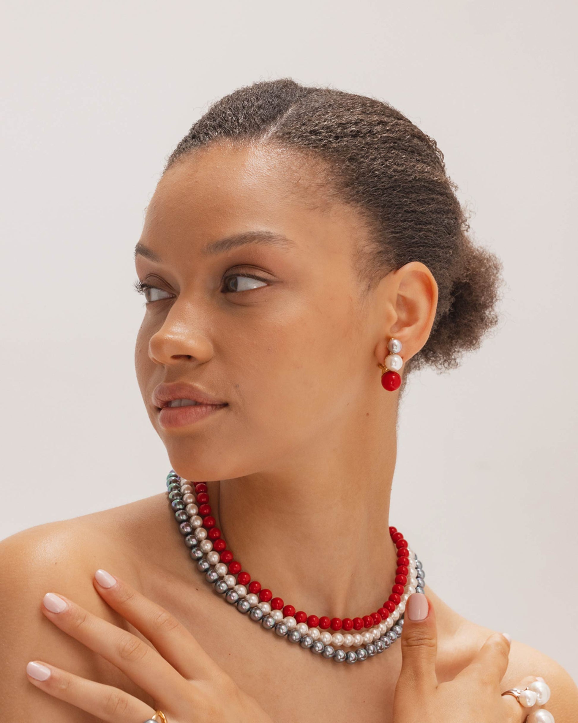 Ohrring aus 18 Karat vergoldetem Silber mit Omega-Verschluss. Eine dreifache runde Perle in Grau, Weiß und Rot mit den Maßen 8, 10 und 12 mm. Perlenkombinationen im unverwechselbaren Stil der 50er Jahre liegen voll im Trend.