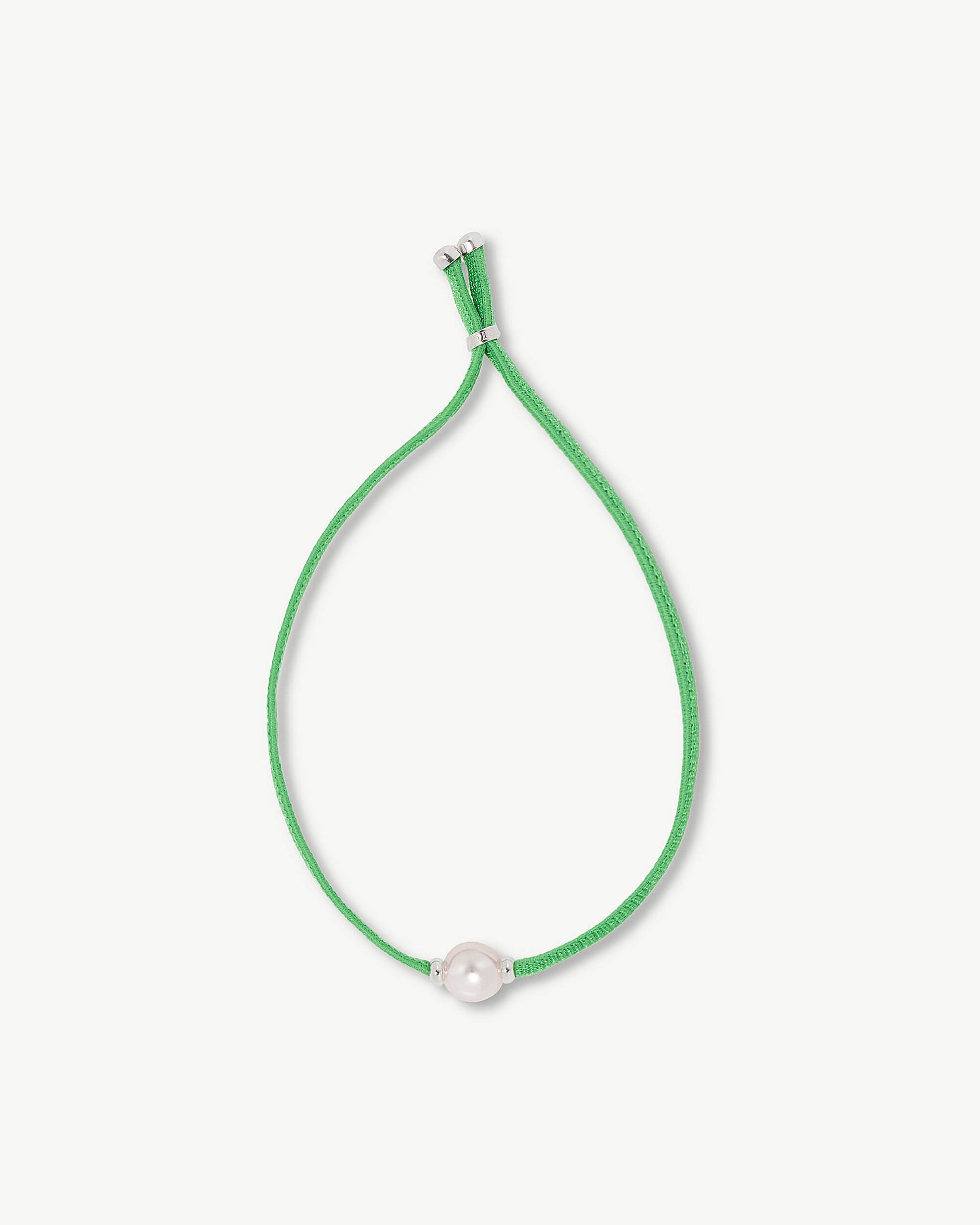 20 cm adjustable elastic bracelet in green, 8 mm white round pearl. The collection is a tribute to strength and empowerment.