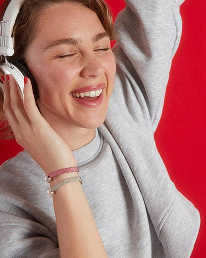Adjustable elastic bracelet with magenta silver threads. The jewelry designed by Majorica for the collection will be your new amulet. Comfortable materials and organic shapes come to your favorite jewelry! It is the collection for those who want to carry the Majorica seal always with them.