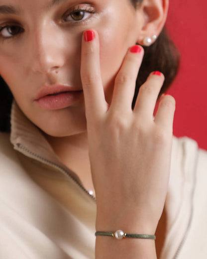 20 cm adjustable elastic bracelet in olive green, 8 mm white round pearl. The collection is a tribute to strength and empowerment.