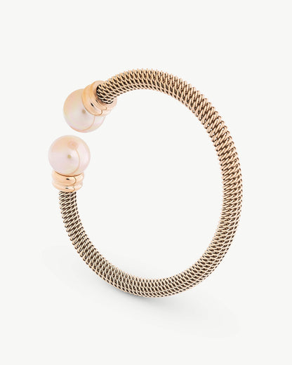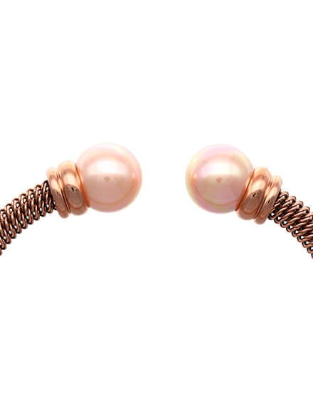 Rigid bracelet in pink steel, 12mm round salmon pearls. For this collection of bracelets, rings and earrings, made of high-quality steel and adorned with pearls, each piece has been created to combine the sobriety of steel with the timelessness of pearls.