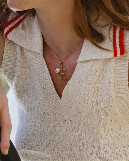 Initial E charm in 18k gold-plated silver with a white pearl. The bamboo capsule represents the exotic jungle, the tall trees with intertwined branches that form a spectacular canopy.