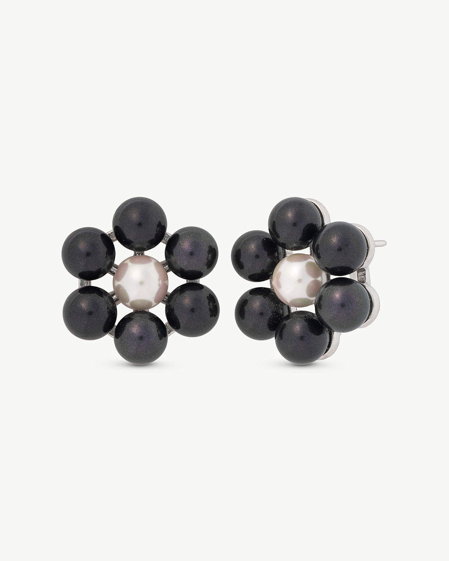 Rhodium-plated silver spike earrings with 6 mm round black and white pearl.