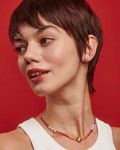 18k gold-plated silver spike earrings with an 8mm white round pearl and purple zirconia. Energy and fun from the 2000s If you like colorful jewelry, go all in on the new Color Pop collection: iconic jewelry that is born from the color palette so representative of the Y2K, today even elevated to a higher level.