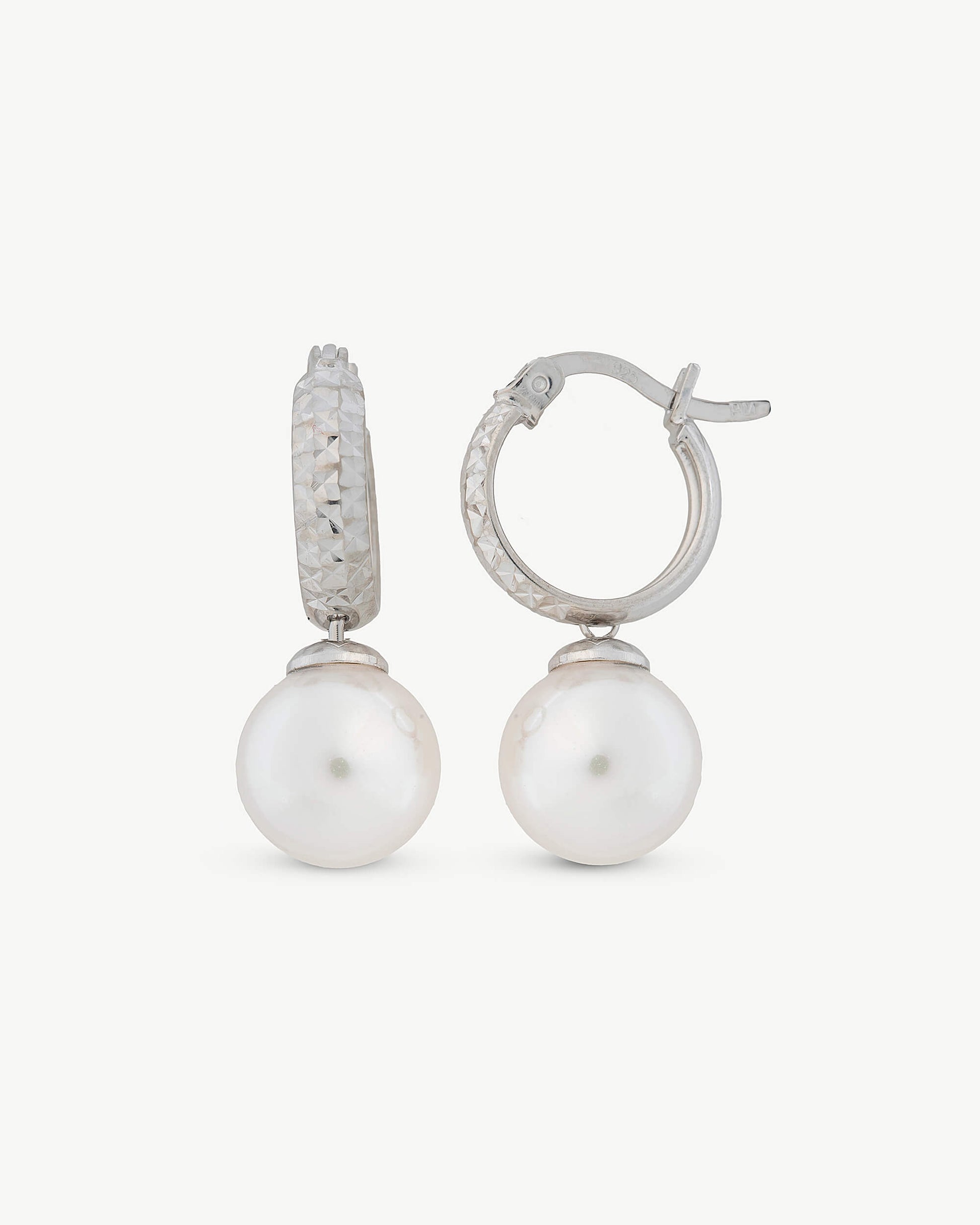 Long hoop earrings in rhodium-plated silver, 10mm white round pearls. We love this combination: earrings and pearls.