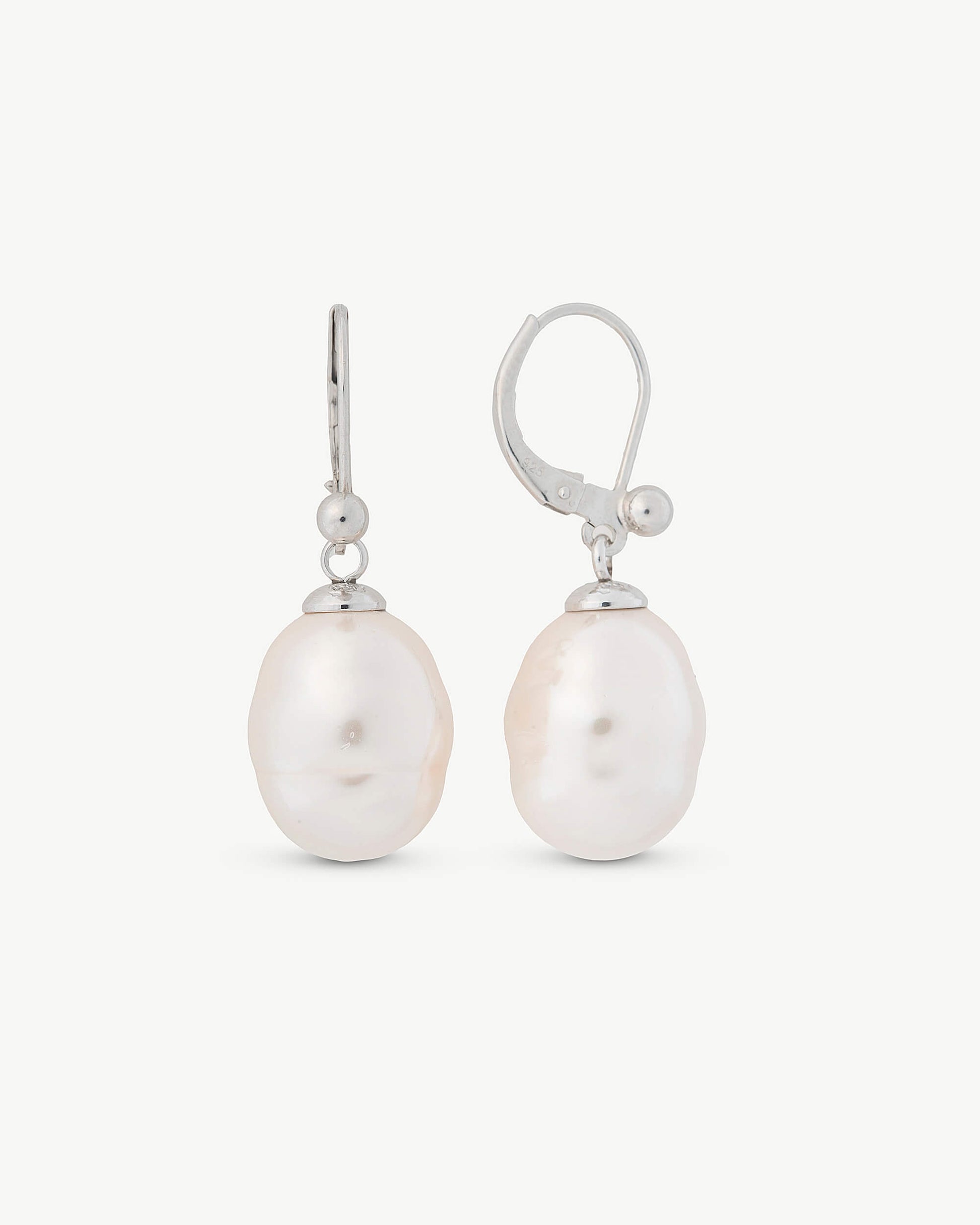 Short French clasp earrings in rhodium-plated silver, 12mm white baroque pearls. Jewelry and pearls with a romantic and very feminine design.
