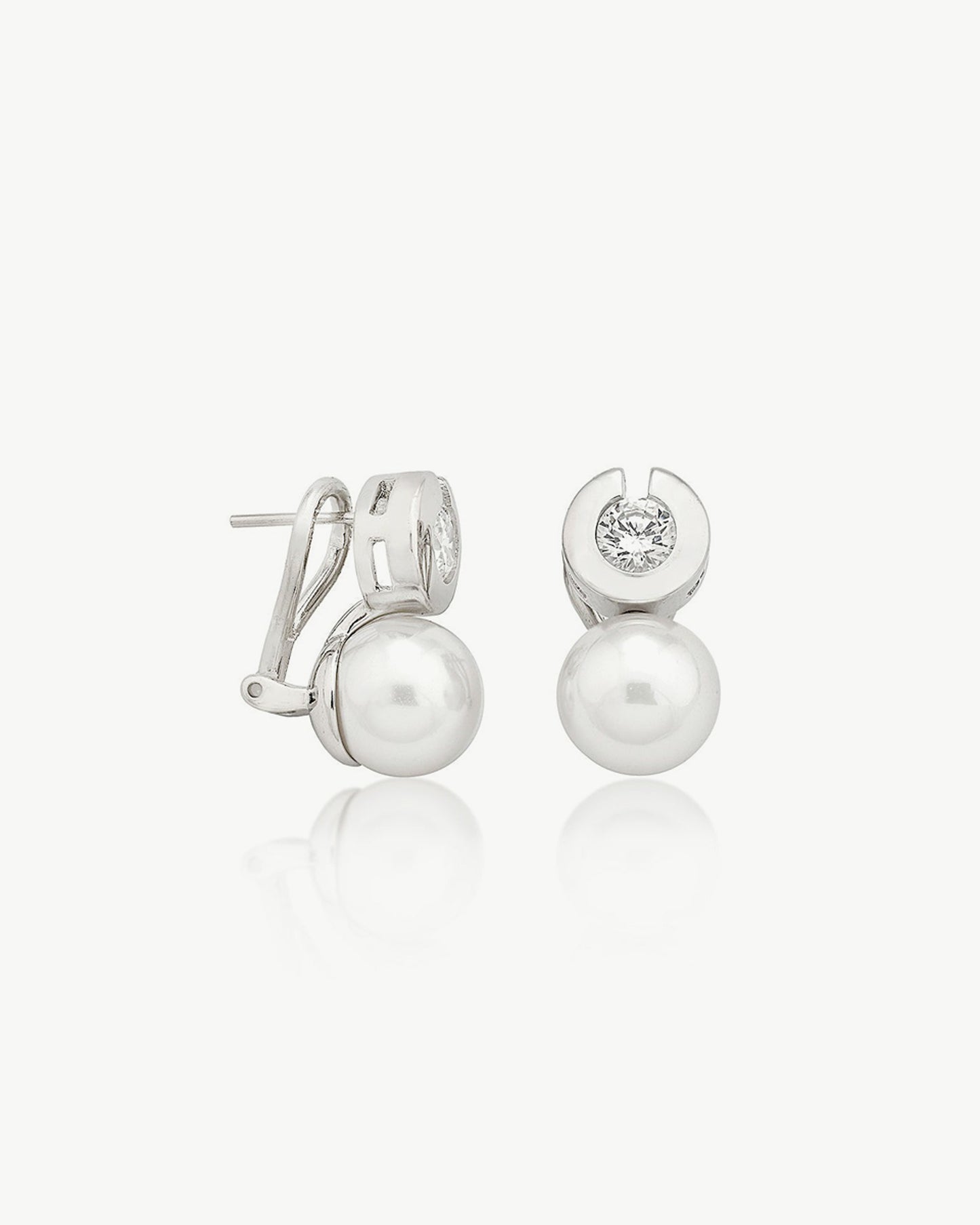 Short omega spike earrings in rhodium-plated silver, 10mm white round pearl and zircons. Along with the pearls, the zircons take center stage in this exquisite collection.