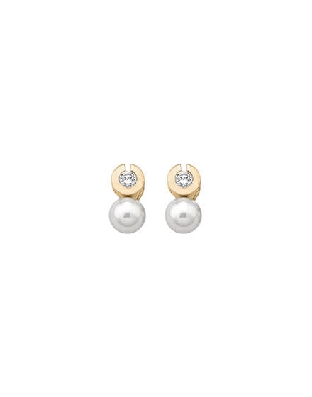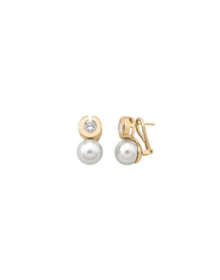 Short earrings, with spiked omega closure, made of plated silver. With 10mm white pearls and zircons. Along with the pearls, the zircons take center stage in this exquisite collection.
