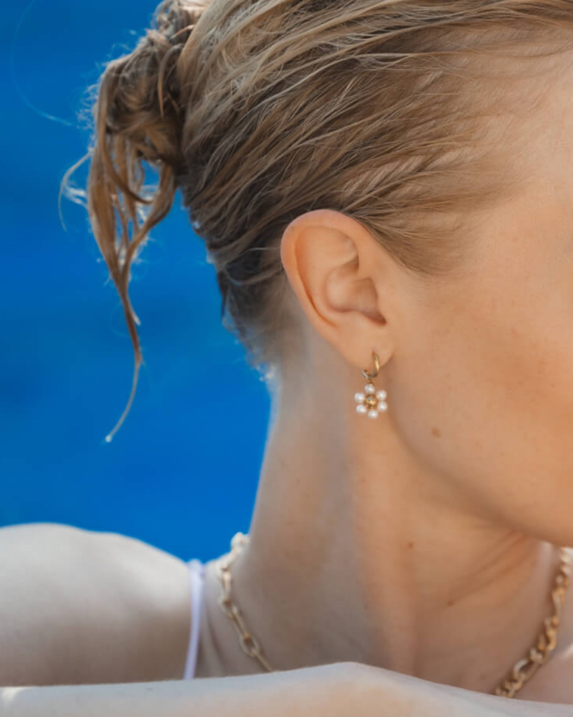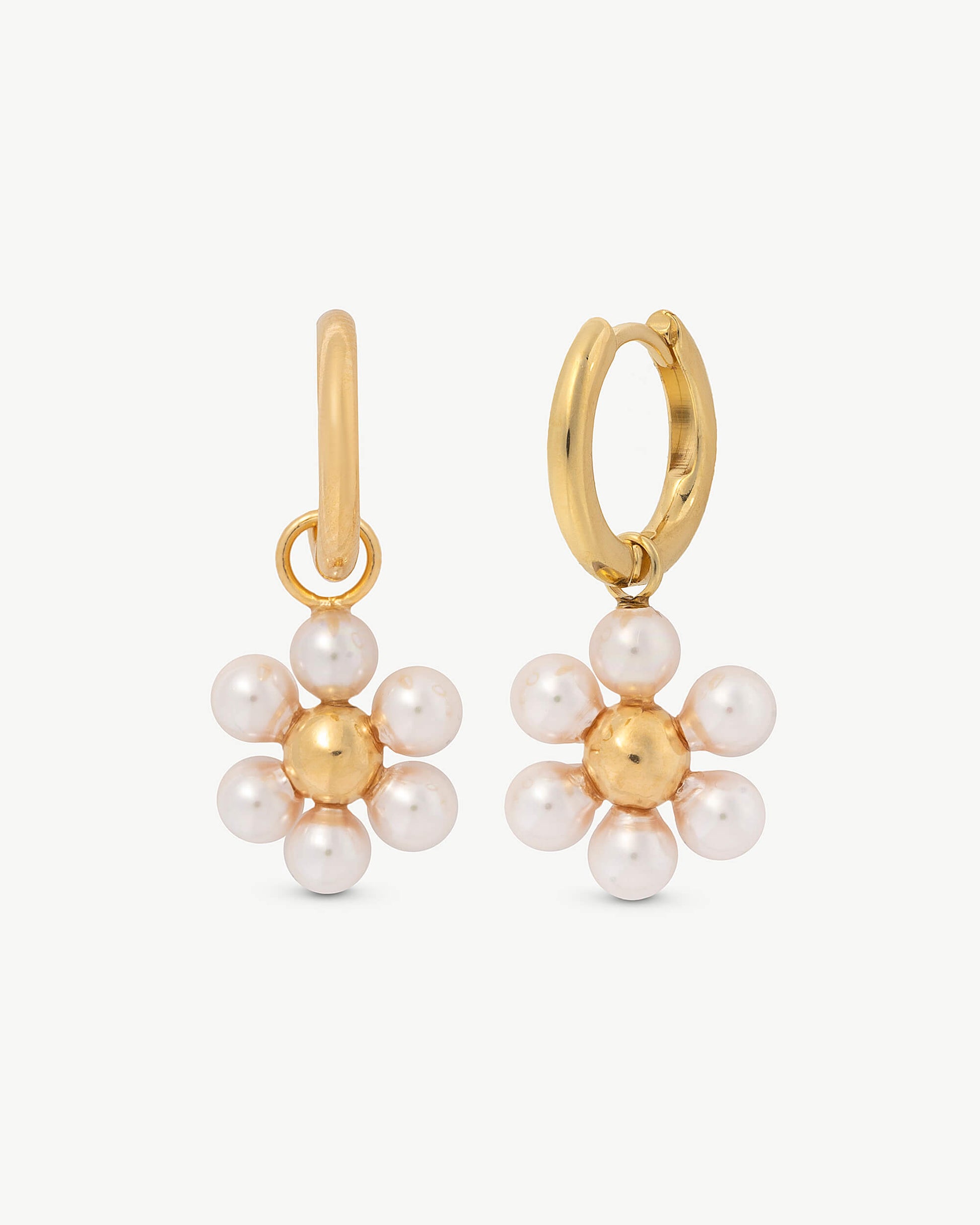 Mini hoop in 18k gold plated silver with white and golden flower in 4mm round white pearls. Majorica flower-shaped brooches from the 1940s inspire new collections