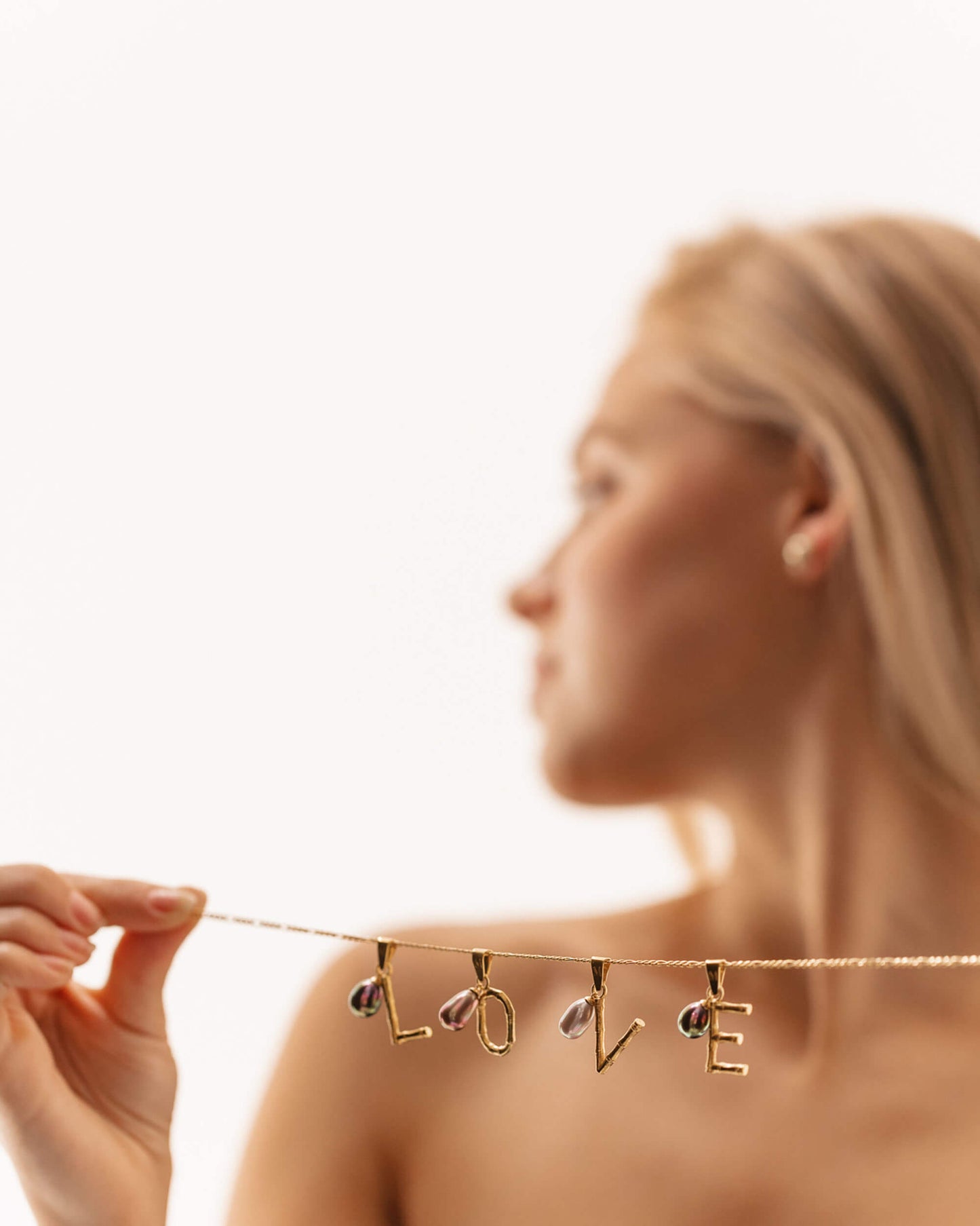 O initial charm in 18k gold-plated silver with an Aubergine pearl. The Bamboo capsule represents the exotic jungle, the tall trees with intertwined branches that form a spectacular canopy.