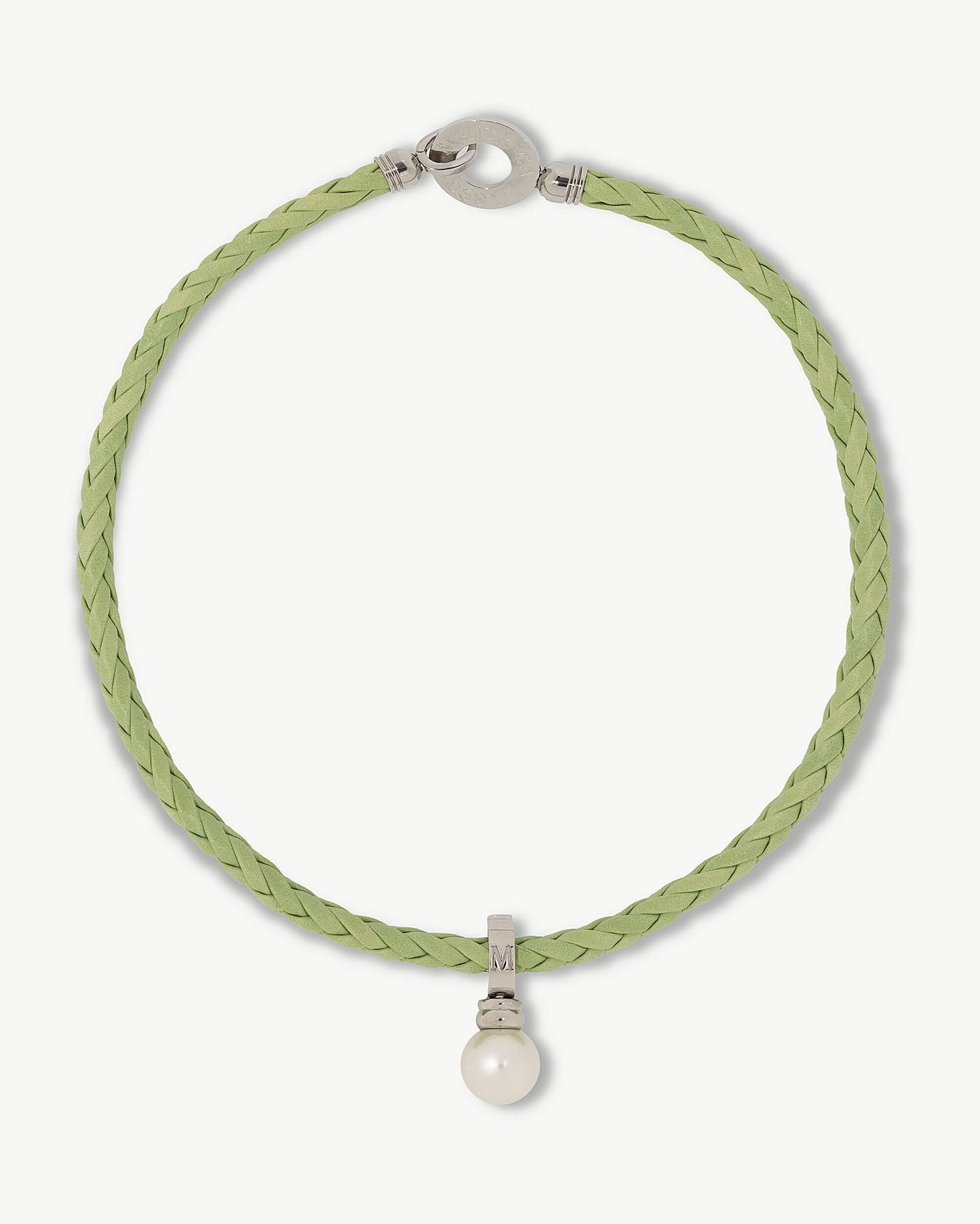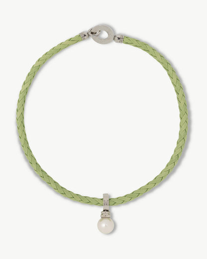 Green braided leather steel necklace with 14mm white round pearl. Casual, high-quality pieces for the most eclectic.
