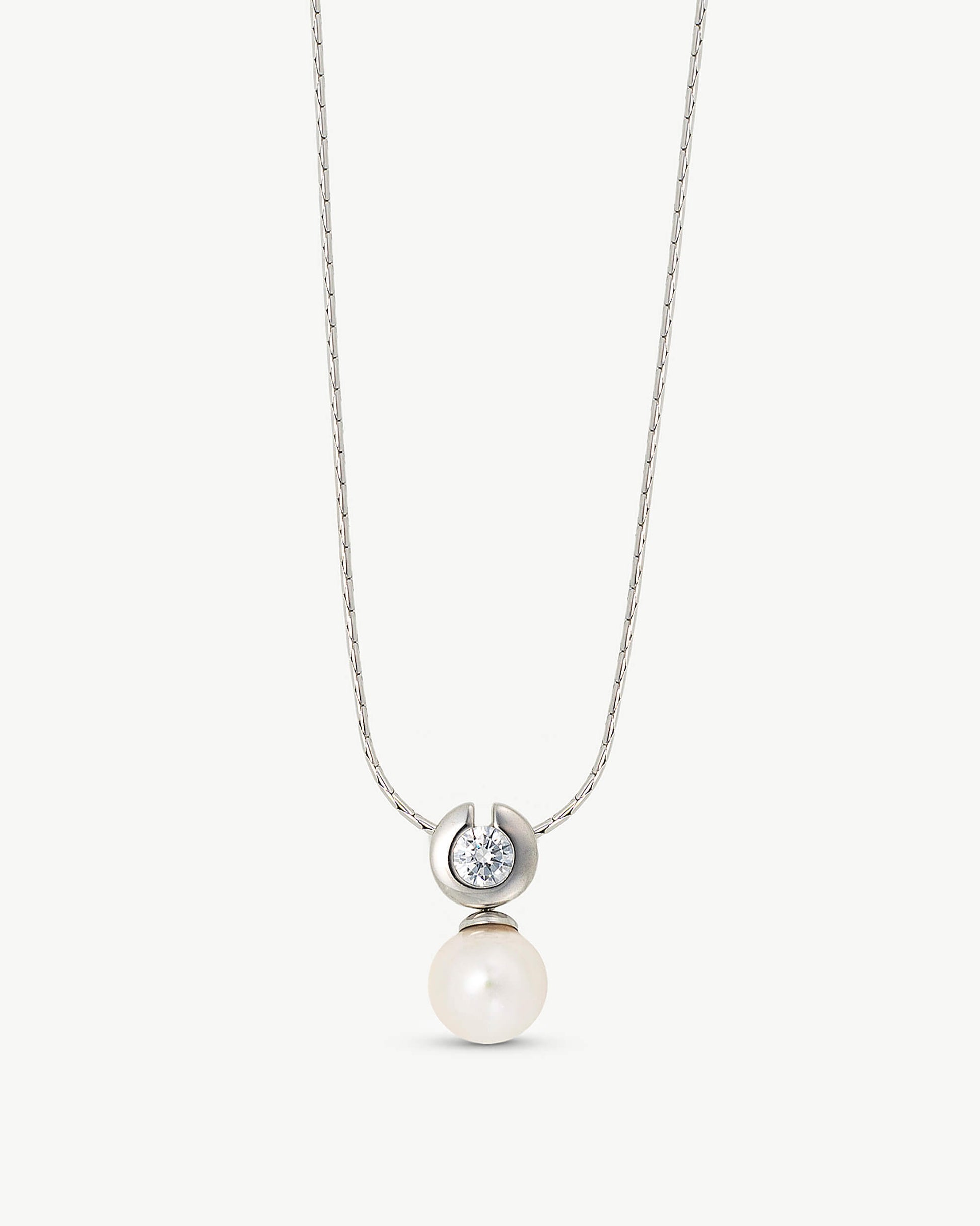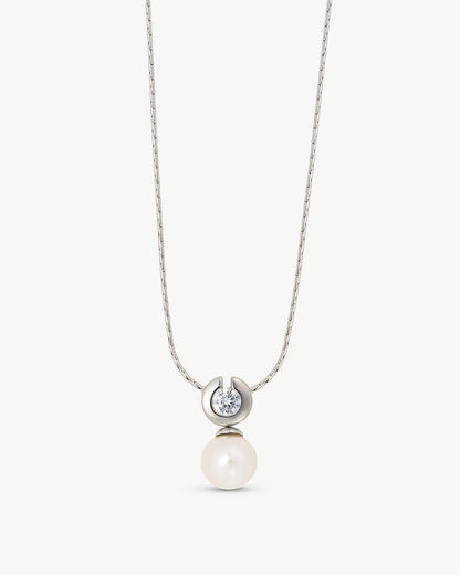 Pendant with 37/42cm chain in rhodium-plated silver, 12mm round white crushed pearl and zircons. Along with the pearls, the zircons take center stage in this exquisite collection.