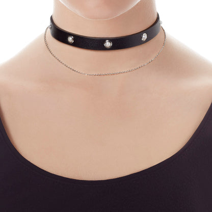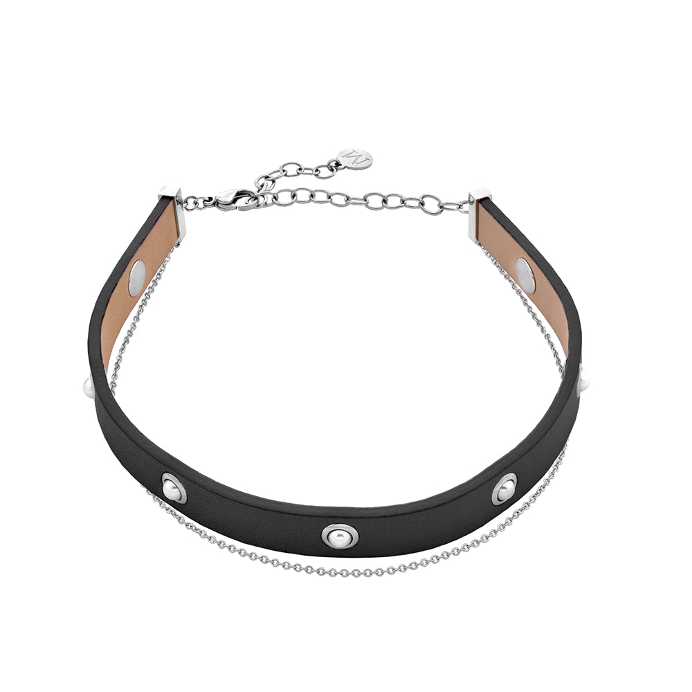 Black leather choker with steel and pearl finishes, and thin silver chain.
