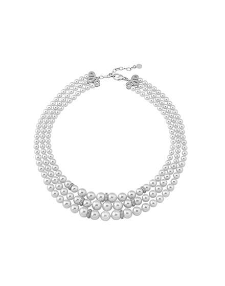 The trick is to play with proportions. Layering several pearl necklaces of different lengths on a minimalist look creates a modern and elegant look at the same time.