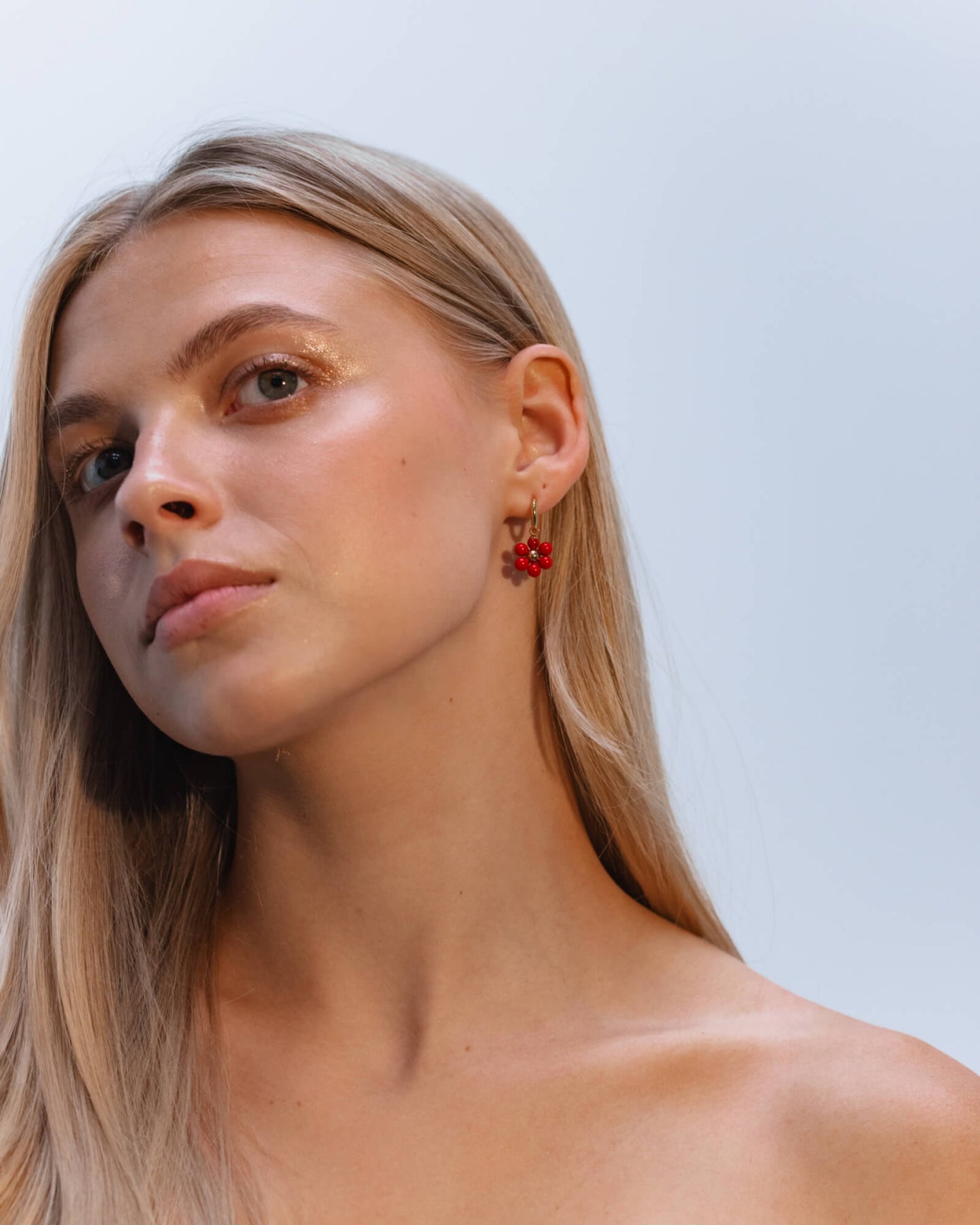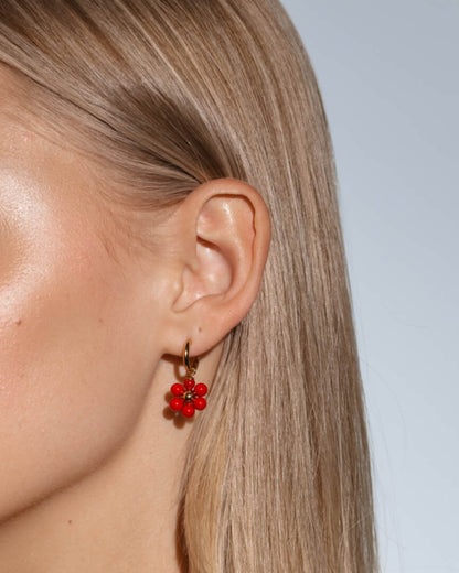 Mini hoop in 18k gold plated silver with red and golden flower in 4mm round red pearls. Majorica flower-shaped brooches from the 1940s inspire new collections