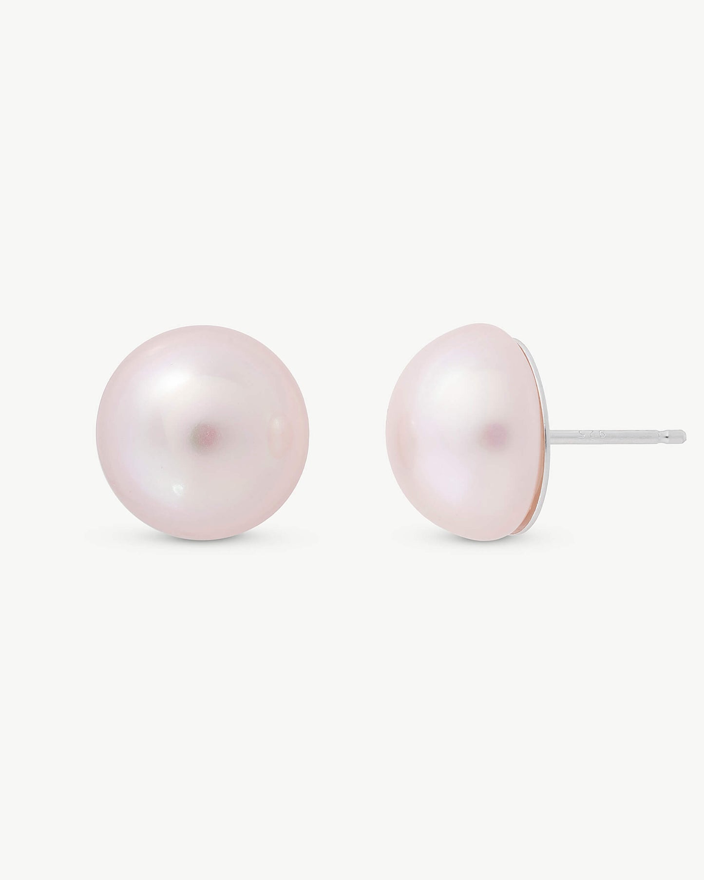 Ball earrings with spike in rhodium-plated silver, 12mm pink mabé pearls.