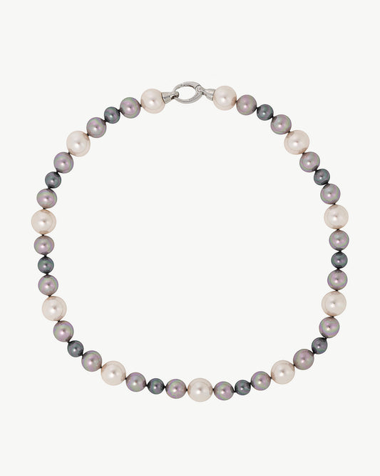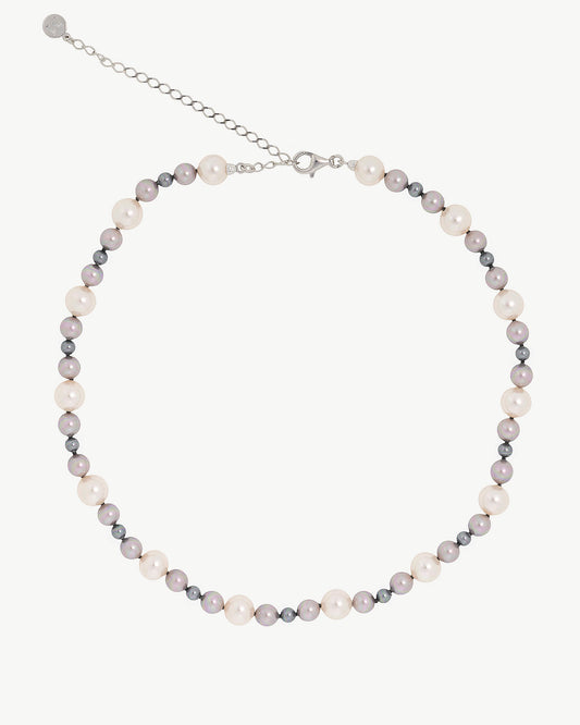 Each necklace features a playful combination of pearl sizes in various hues or monochrome, making them versatile accessories. From classic white to subtle gray in captivating shades, these pearls capture the eye and adorn your neck with personality. Additionally, the Degrade necklaces feature an elegant silver finish, adding a timeless, urban touch to the collection.