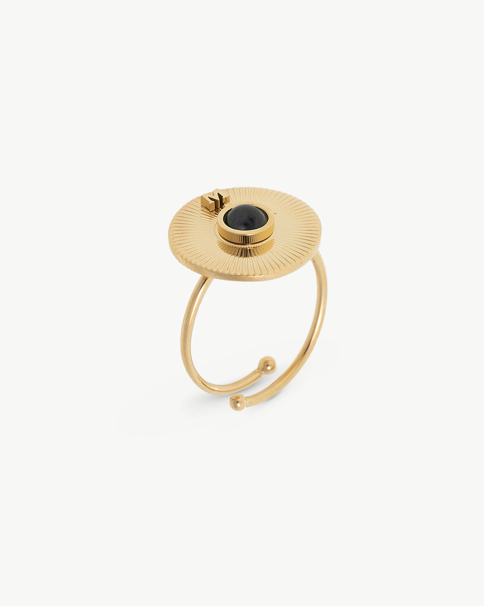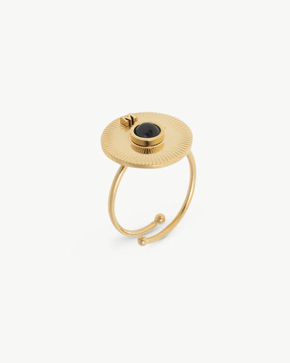 The sun as a symbol of eternity. The circular shape as a reflection of perfection. Inspired by the grandeur of ancient Egypt, this adjustable ring in gold-plated steel captures the essence of the details that once adorned the past and that shine even brighter today.
