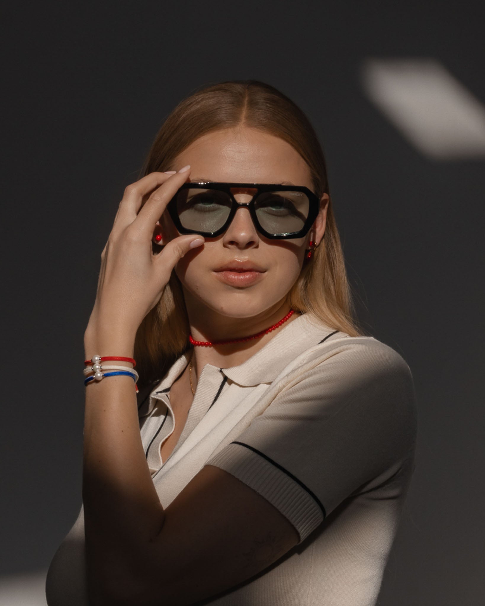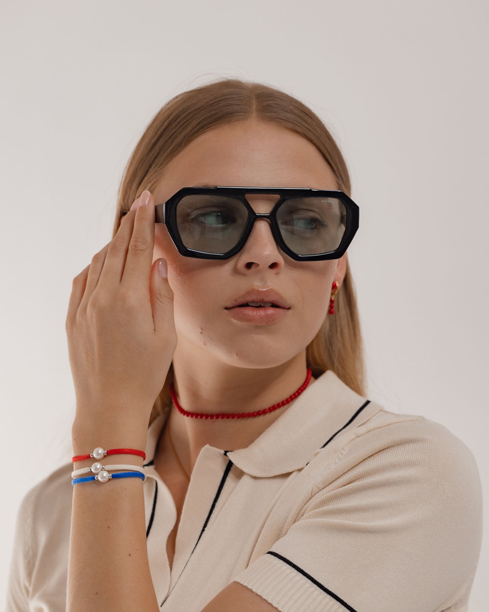 The trick is to play with proportions. Layering several pearl necklaces of different lengths on a minimalist look creates a modern and elegant look at the same time.