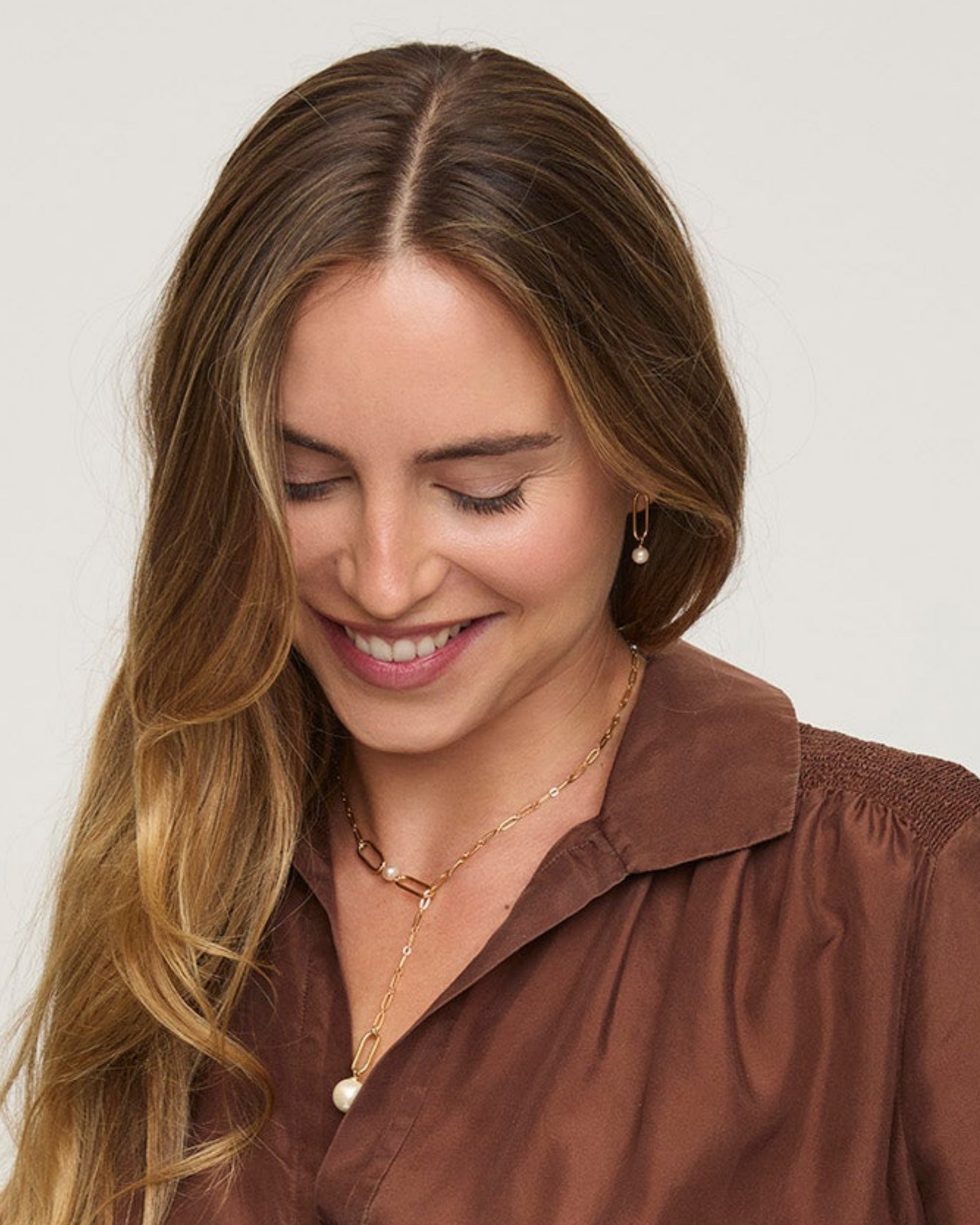 The trick is to play with proportions. Layering several pearl necklaces of different lengths on a minimalist look creates a modern and elegant look at the same time.