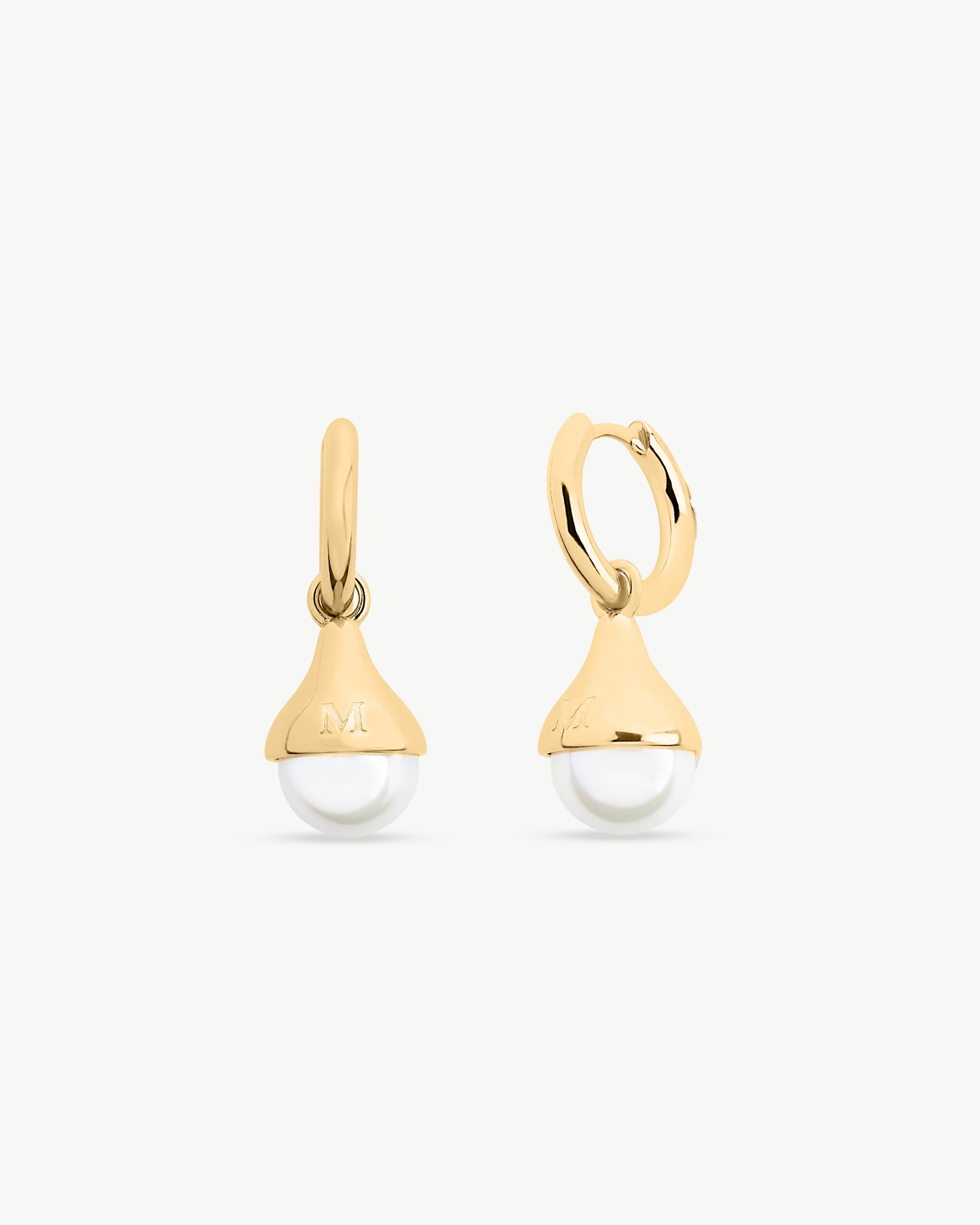 2.6cm long hoop earrings with a teardrop-shaped white pearl and an 8mm pearl (pearl size). The Drop earrings are made of 18k gold-plated silver.