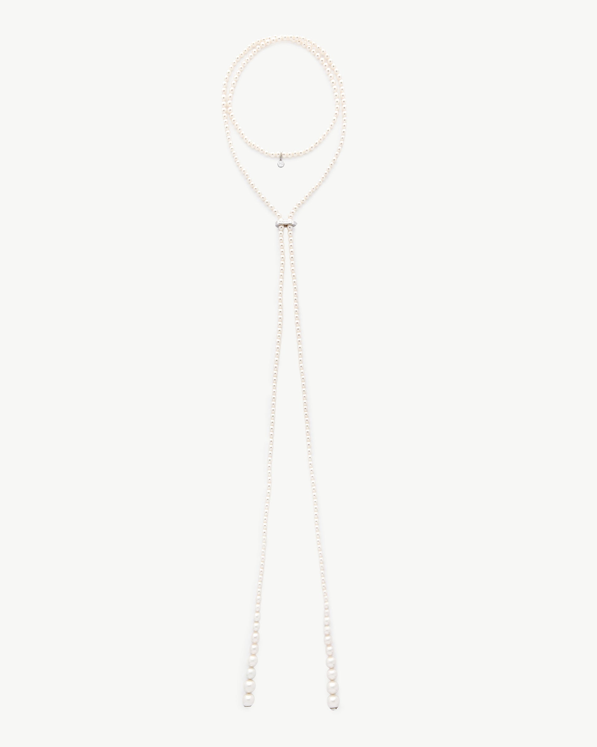 Long pearl necklace, 130 cm long and open design. The necklace is made with handcrafted round white Majorica pearls in graduated sizes of 4, 5, 6, 7, 8, and 9 mm. The necklace is strung and knotted by hand. It includes a medal and an adjustable silver clasp. The clasp allows the necklace to be worn in different positions. It can also be knotted.