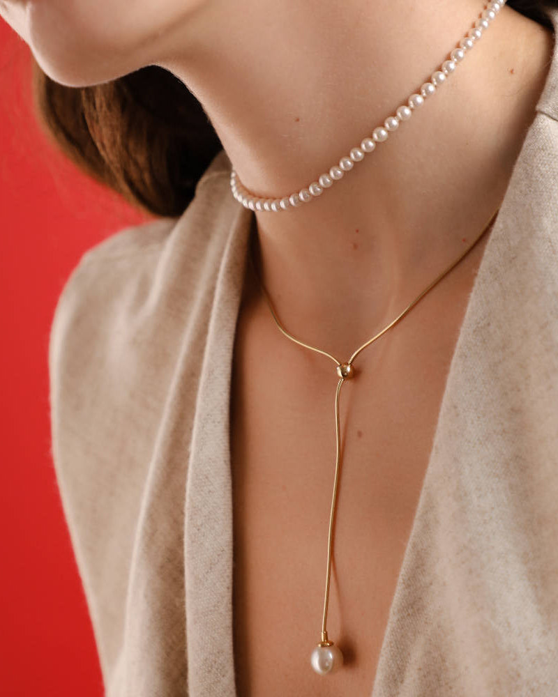 The trick is to play with proportions. Layering several pearl necklaces of different lengths on a minimalist look creates a modern and elegant look at the same time.
