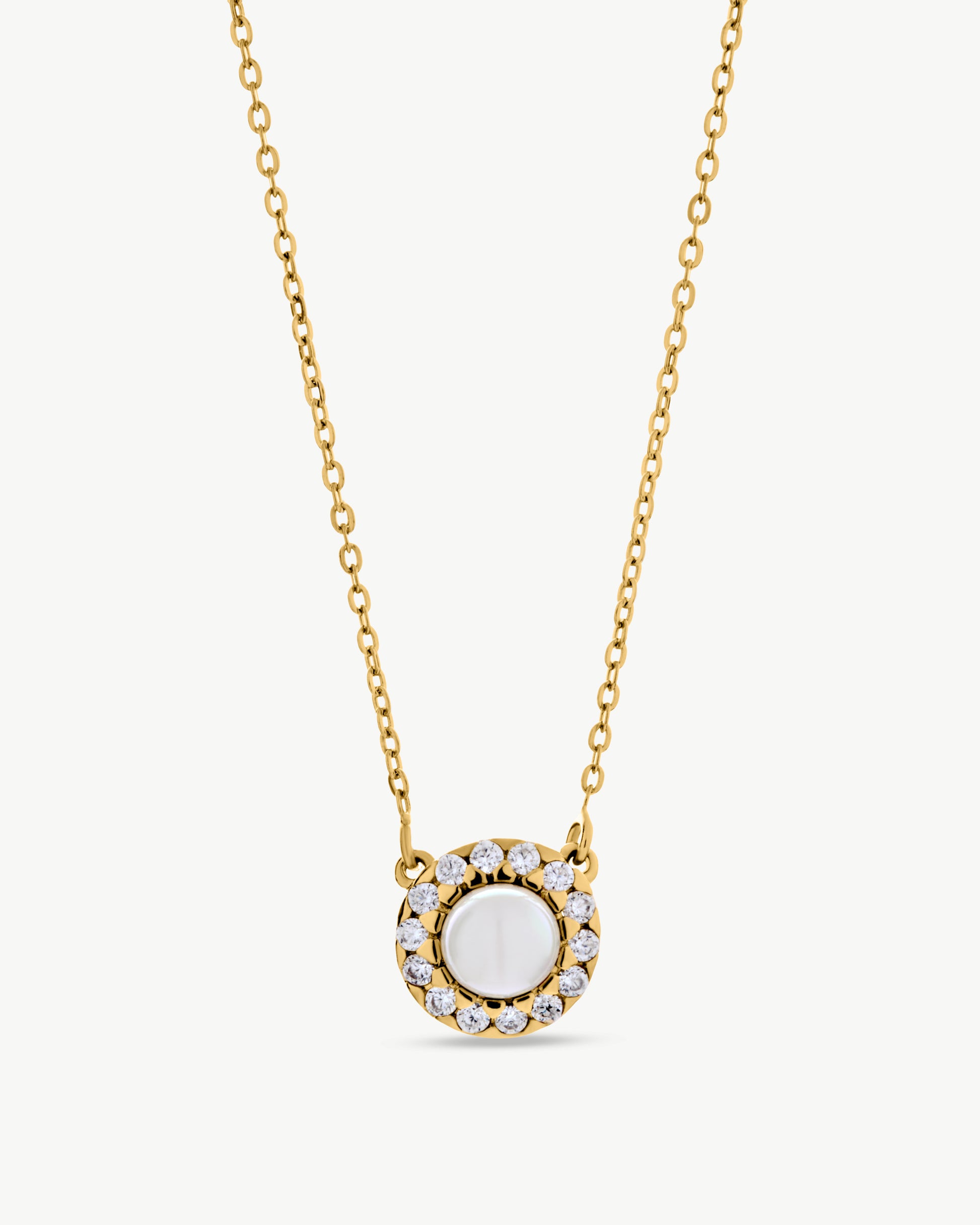 18k gold-plated sterling silver pendant chain, 37cm long, with a lobster clasp. Classic and elegant, it features a central rosette of zircons adorning a 6mm round white handcrafted pearl.