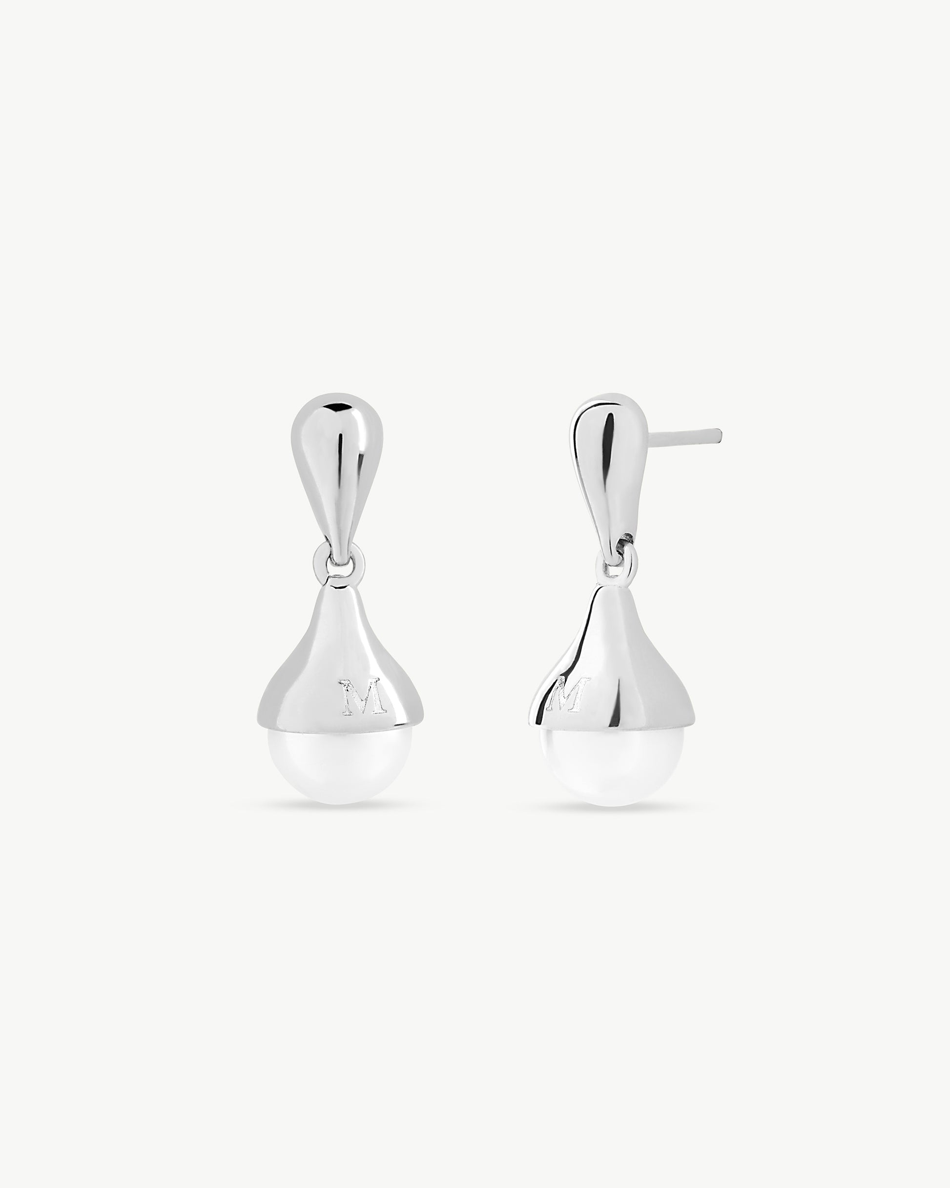 Short earrings, 2.6 cm long, made of sterling silver with a rhodium-plated finish for added shine. The design features an 8 mm round, teardrop-shaped white pearl (pearl size).