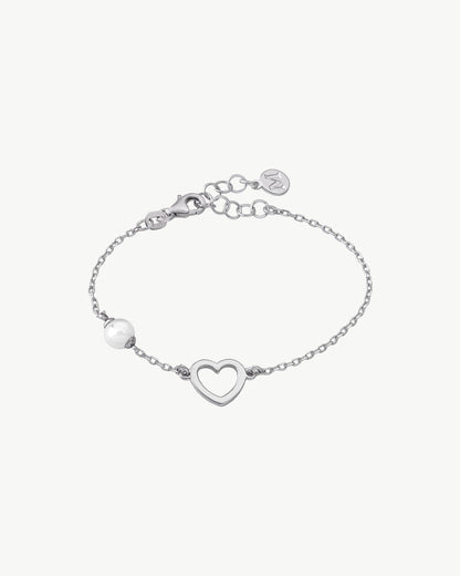 Brazalete de 15/18cm en plata con motivo corazón, perla redonda blanca de 6mm.