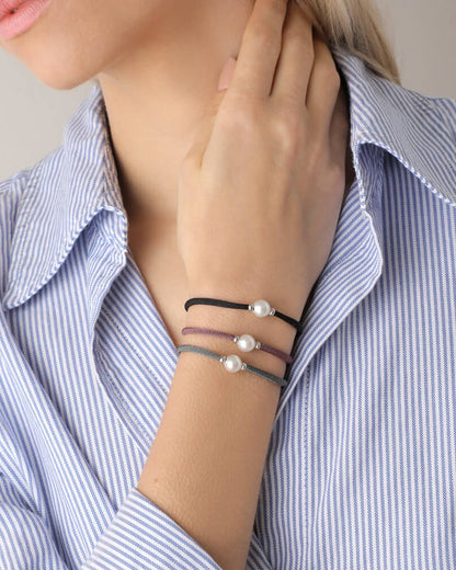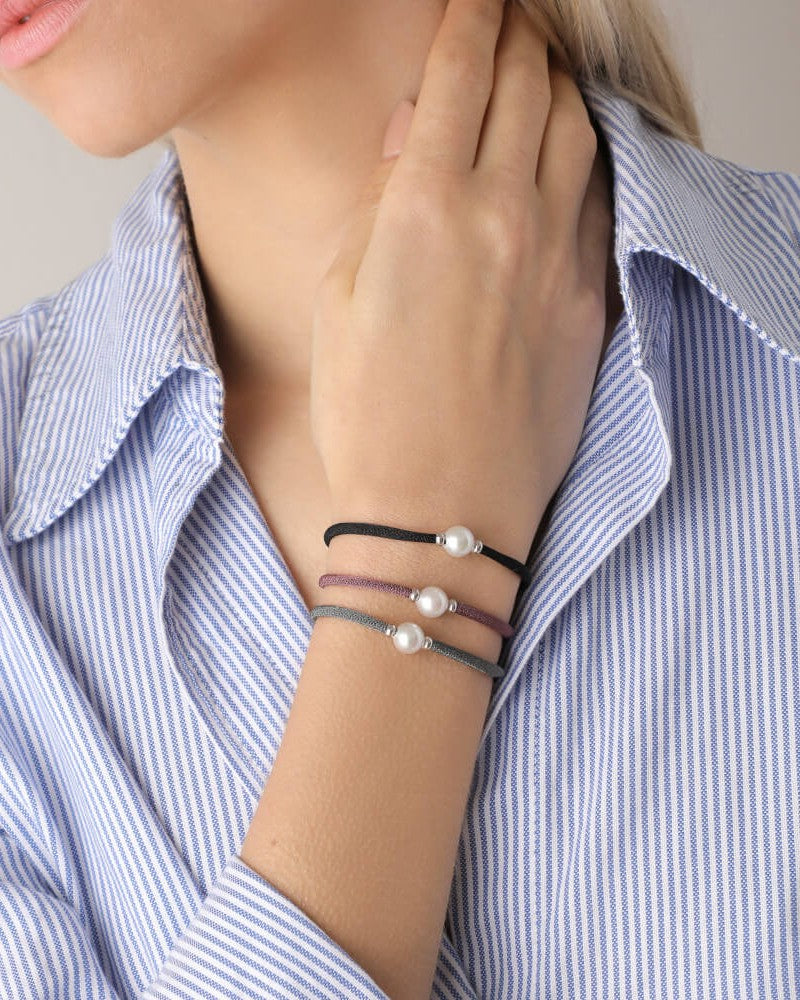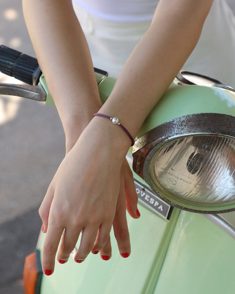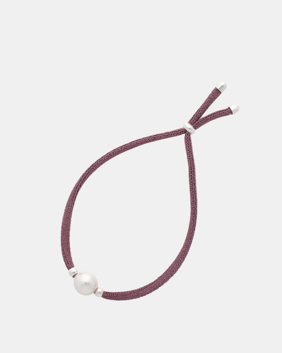 Brazalete elástico de 20 cm ajustable en color magenta, perla redonda blanca de 8 mm.. La colección Sifnos es un tributo a la fuerza y empoderamiento.