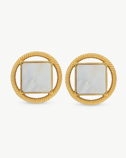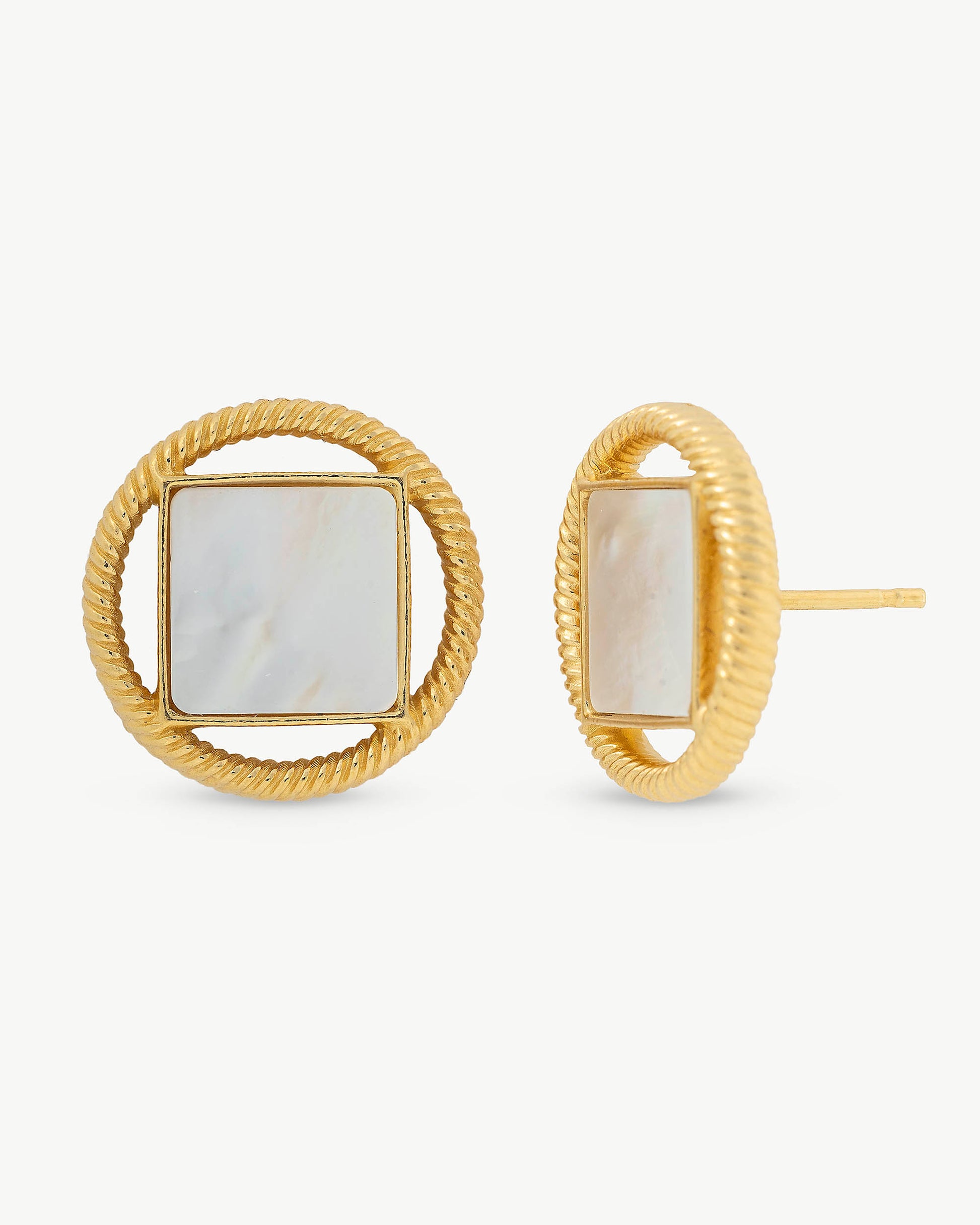 Pendientes de botón en plata bañado en oro de 18k con pastilla cuadrada en nácar.