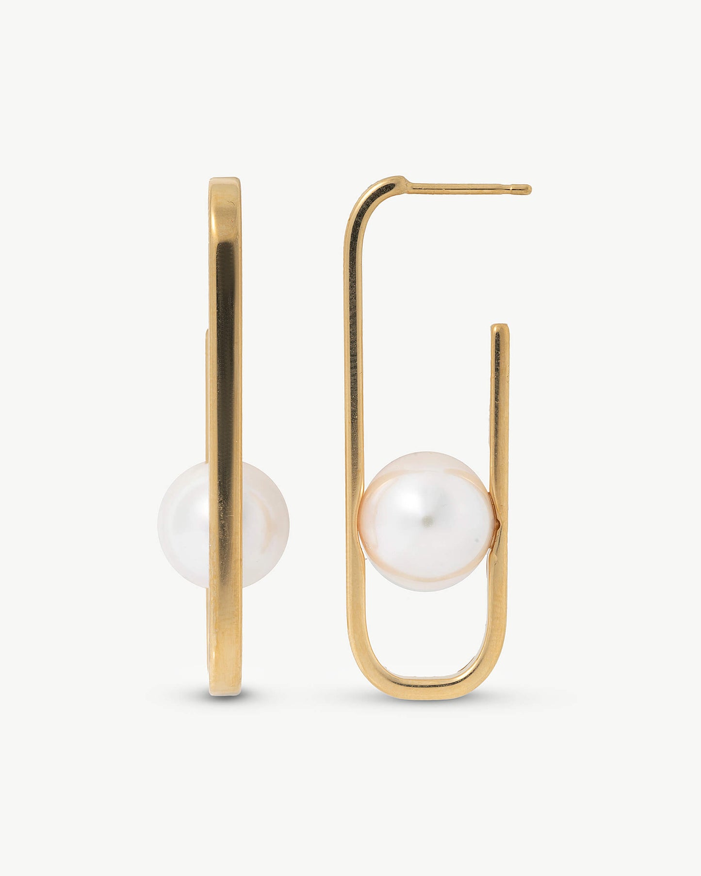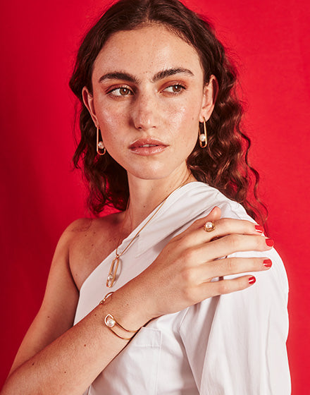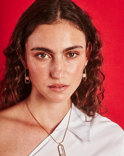 Atenea combina perlas redondas y media bola blancas con estructuras de formas ovaladas abiertas de plata bañada en oro para crear un conjunto irresistible de accesorios. Y es que es ese contraste justo el que hace aún más especiales a sus piezas, en perfecta sintonía entre lo clásico ya presente siempre en la perla y las líneas fluidas tan vanguardistas que dan vida a los diseños.