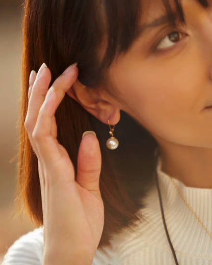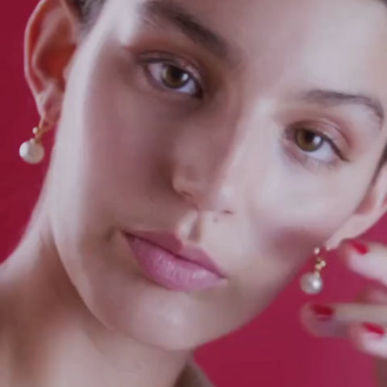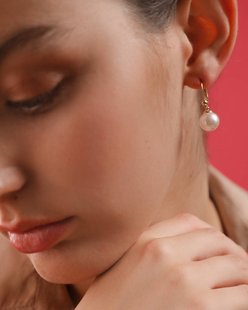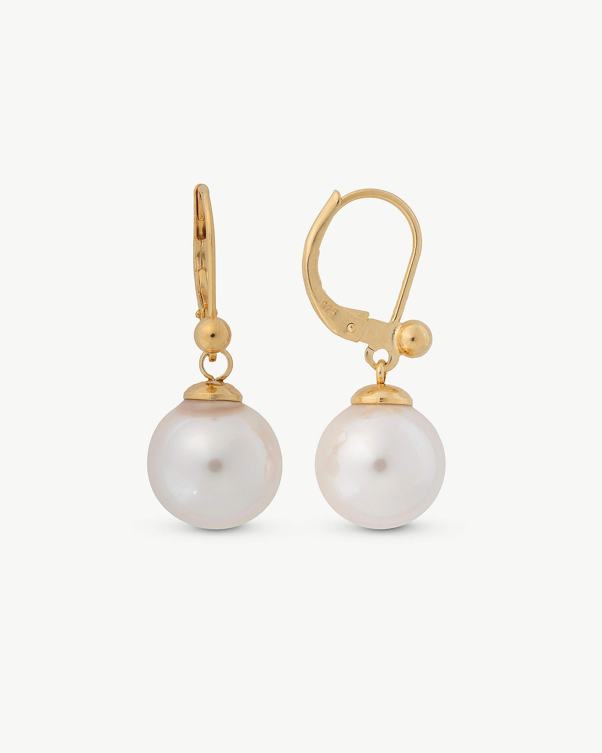 Pendientes cortos con cierre francés en plata bañada en oro de 18k y perlas redondas blancas de 10 mm.