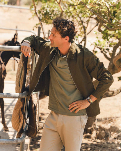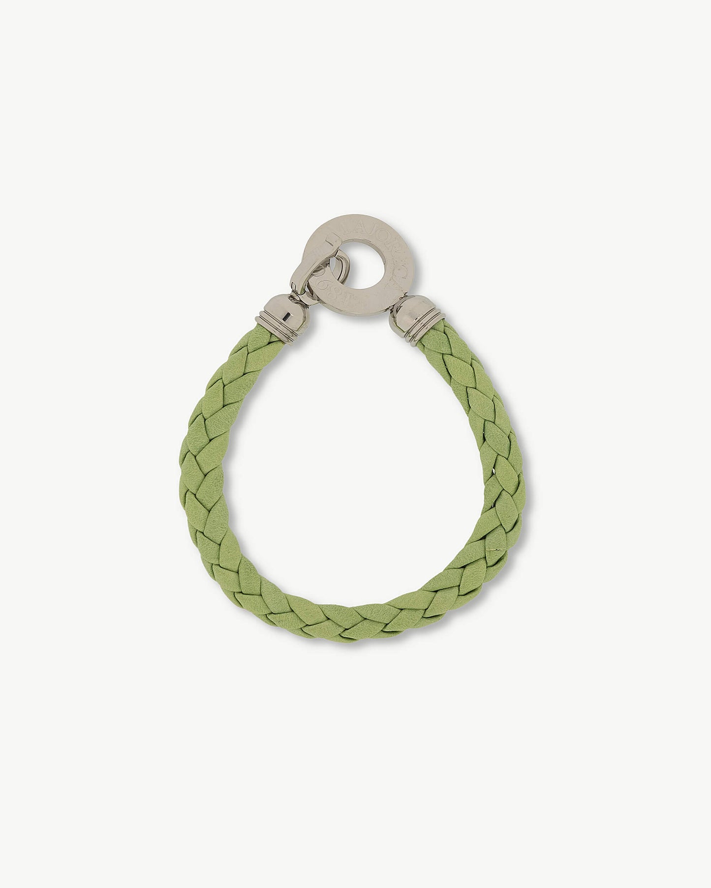 Brazalete en acero dorado y cuero trenzado verde. Largo 19cm. Piezas desenfadadas de gran calidad para los más eclécticos