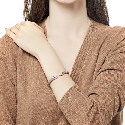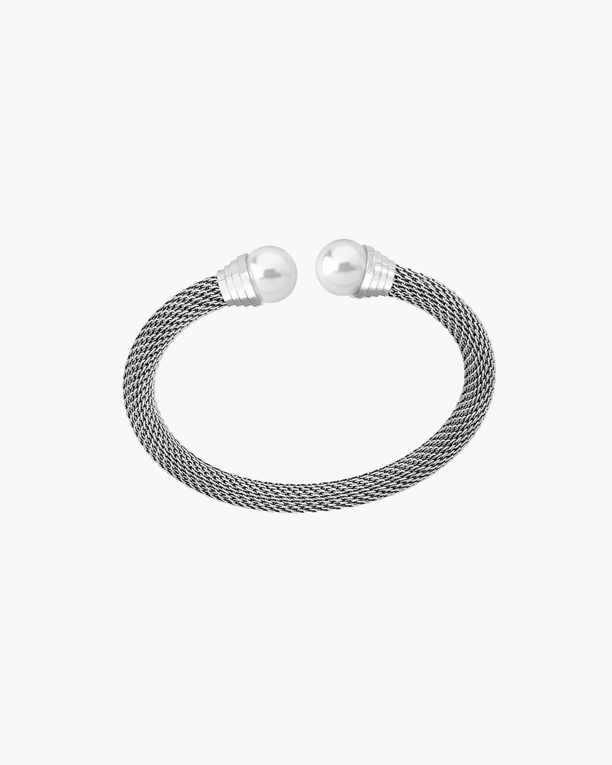 Brazalete o pulsera rígida de 46x58mm de acero, con 2 perlas redondas blancas de 10mm., en los extremos.