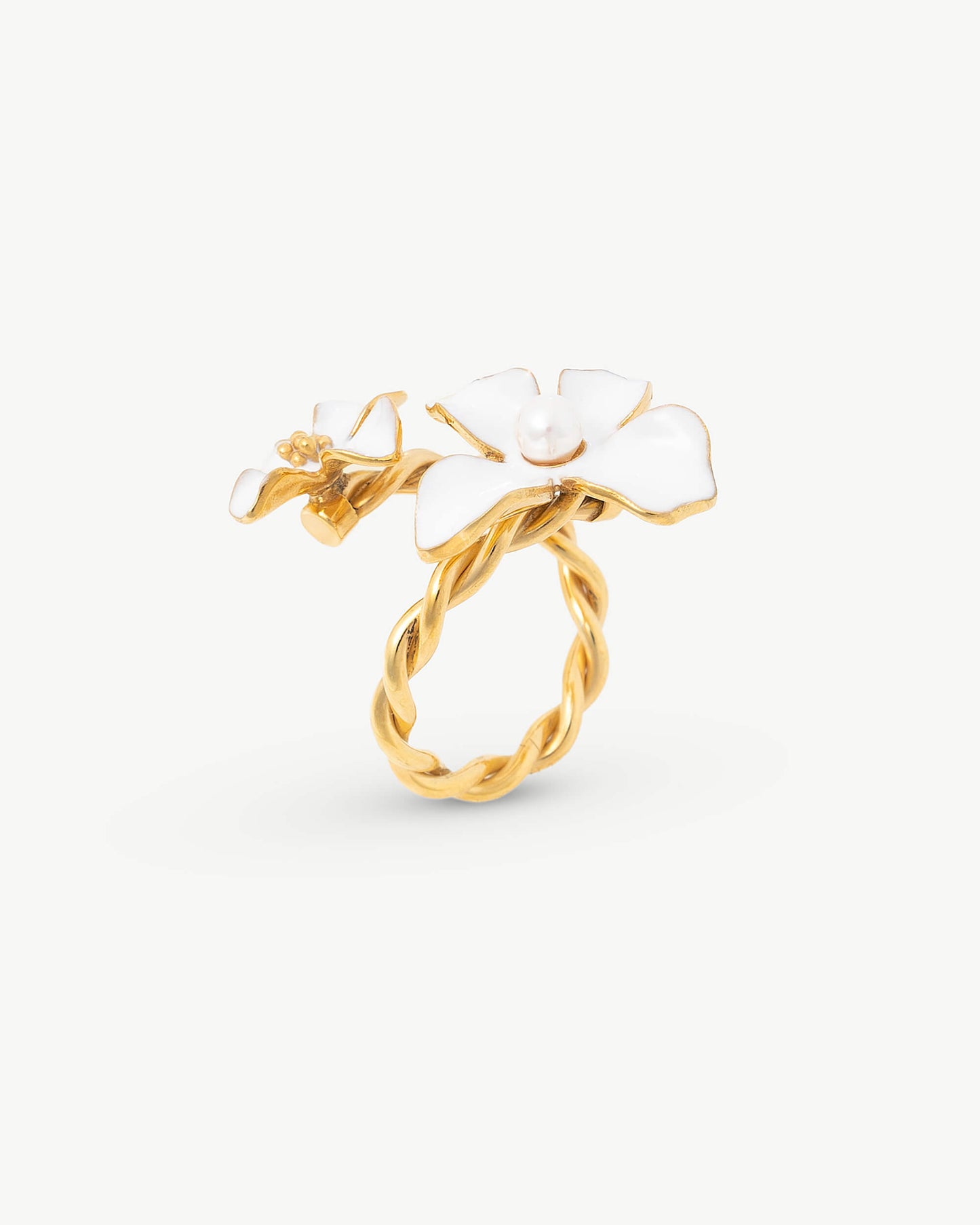 Anillo en plata bañada en oro de 18k con flor blanca. Perlas blancas de 4mm redondas. Las flores esmaltadas sobre plata bañada en oro de 18k brillan para ocasiones de día y de noche.