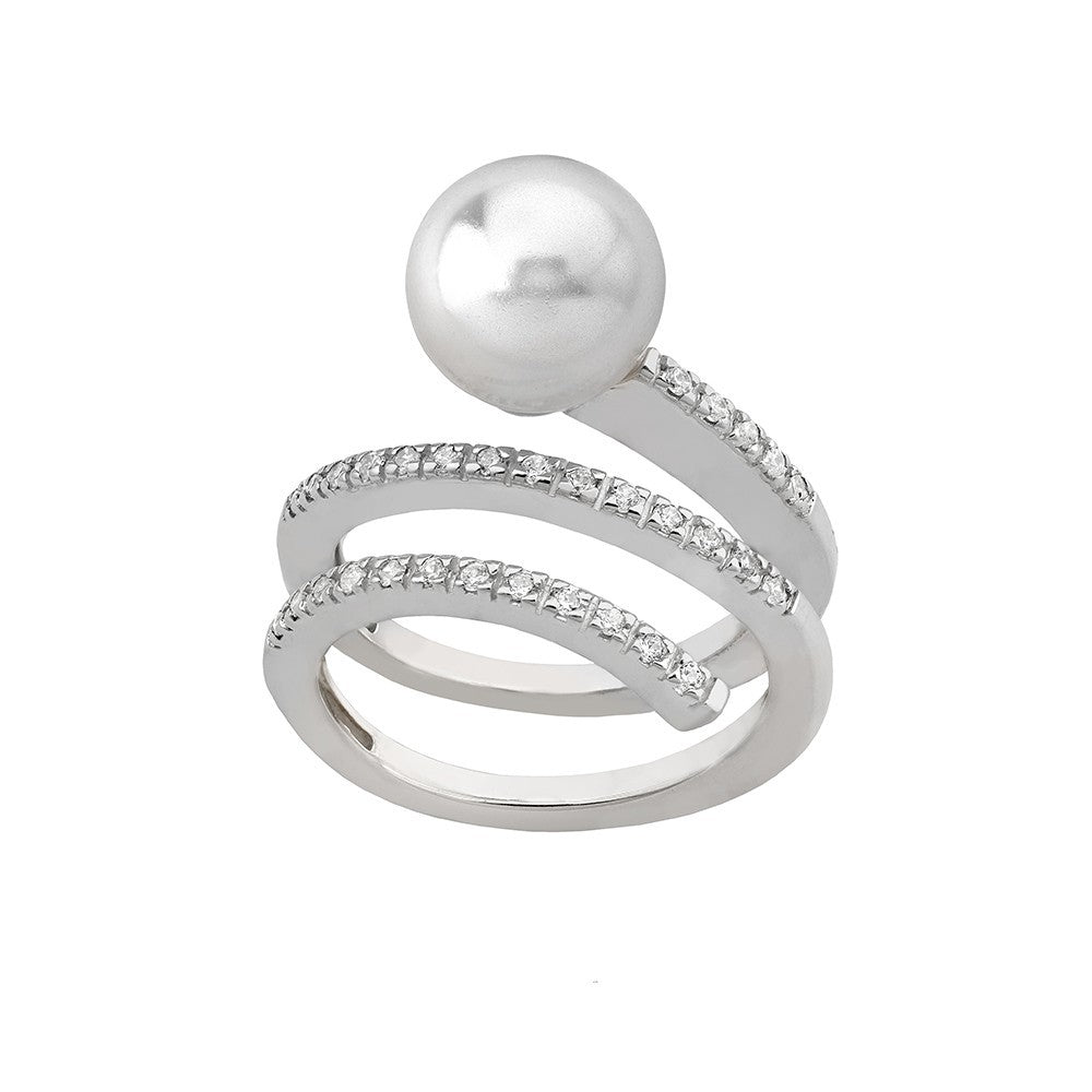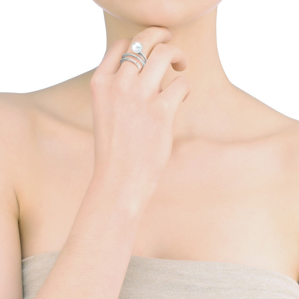 Anillo de plata con forma de espiral acabada en una perla blanca redonda de 10mm. La espiral del anillo esta engarzada con circonitas. El efecto del brillo de las circonitas y la gran perla como acabado de este diseño, conceden a la mano una belleza y elegancia ideal para eventos y ocasiones de gala tanto de día como de noche.